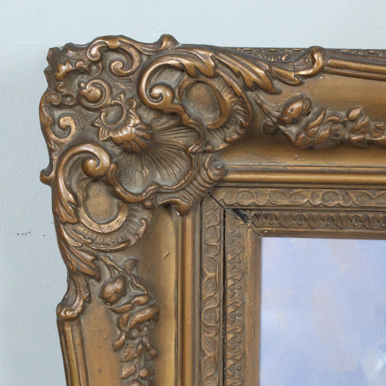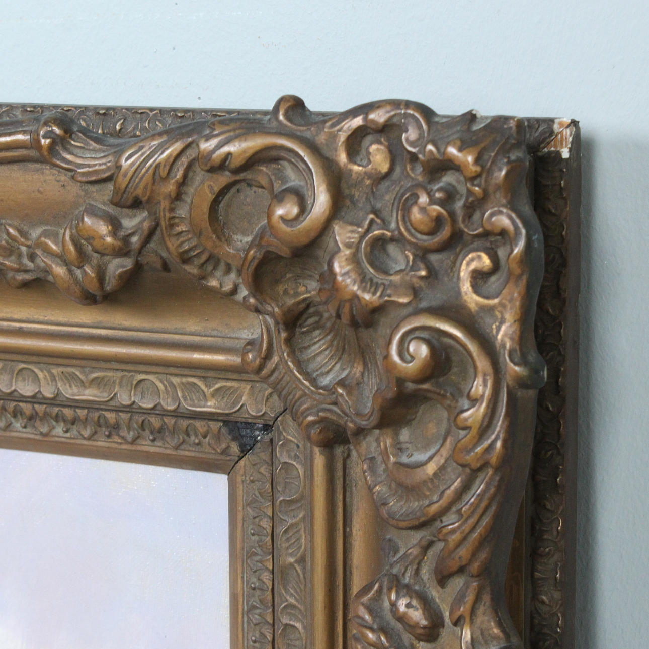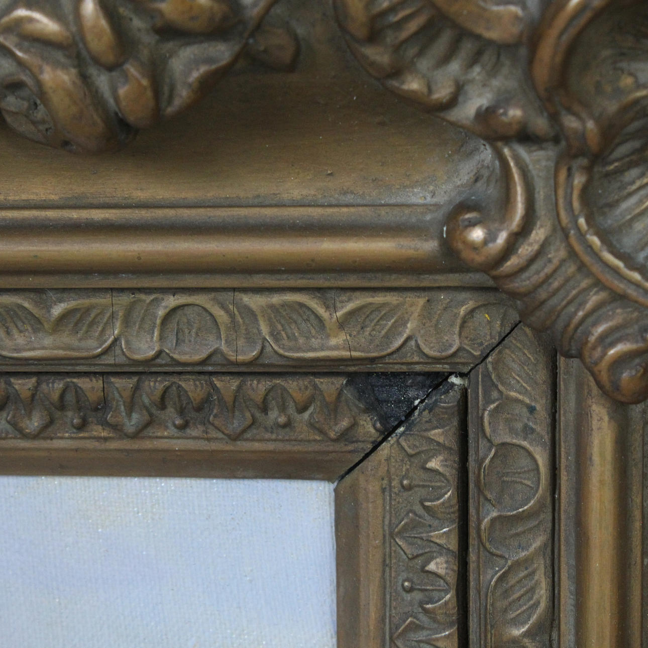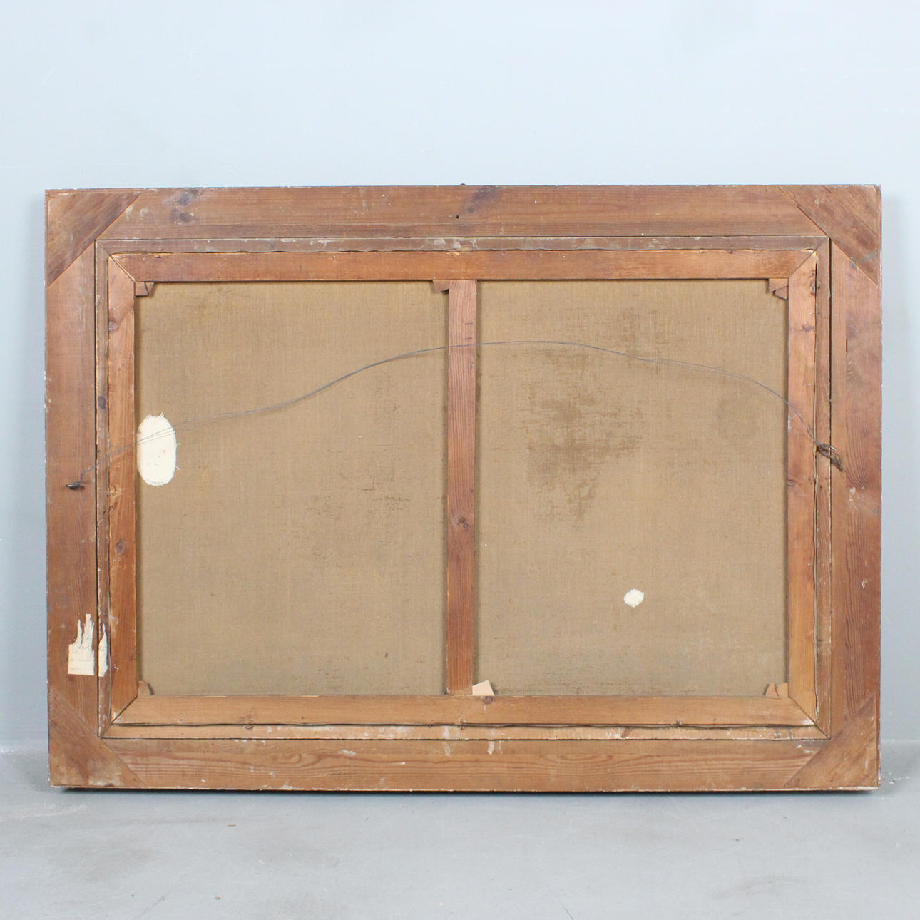 Altersgemäßer Zustand mit Gebrauchspuren, kleinere Farbabplatzungen am Bild. Laut Einlieferer wurde das Bild vor 2 Jahren fachmännisch gereinigt. Rahmen teilweise bestoßen, rückseitig wurden zwei Stellen restauriert.