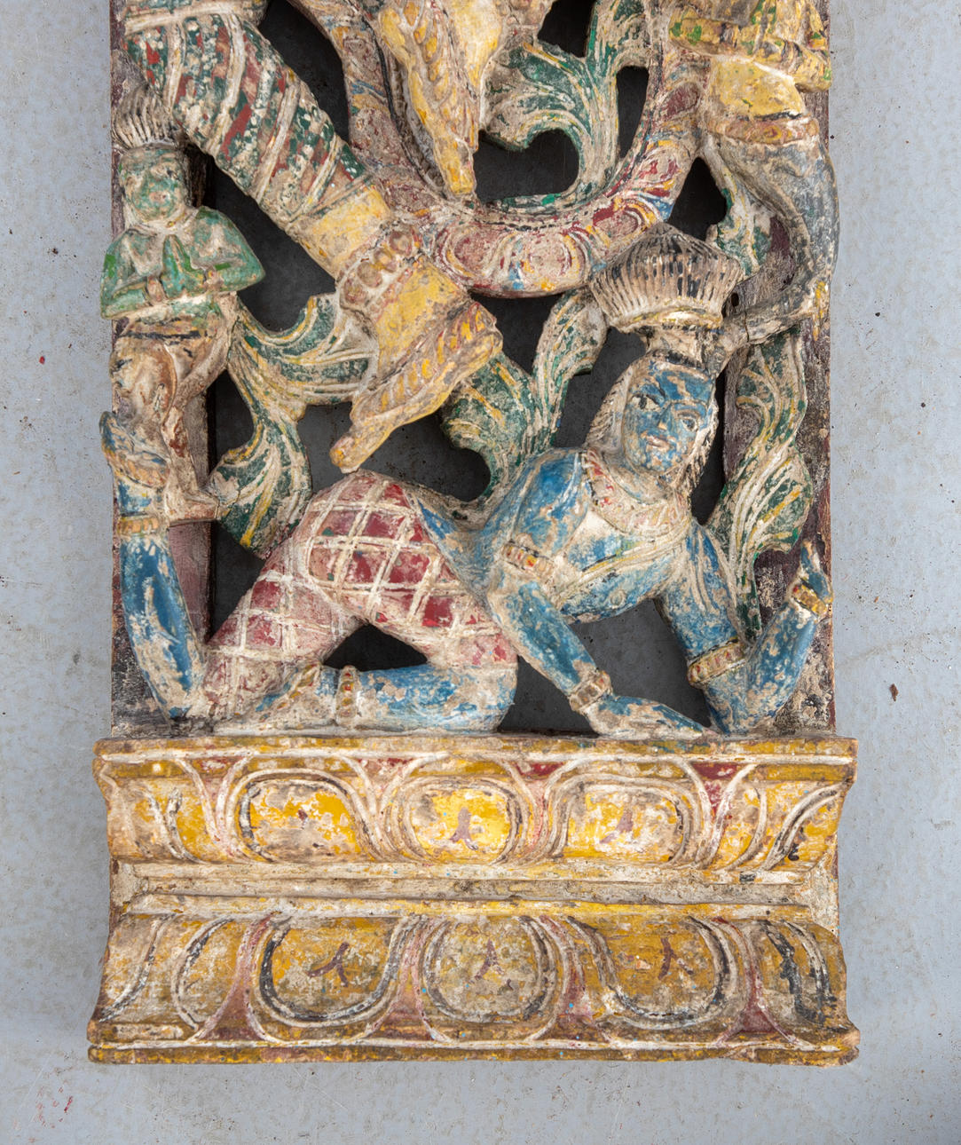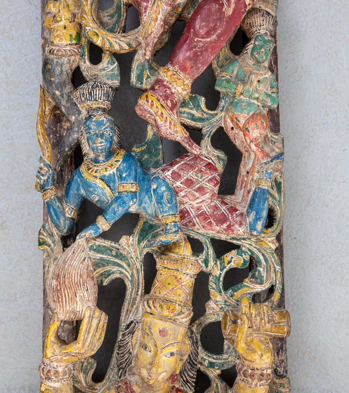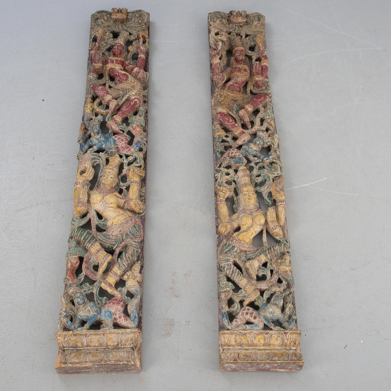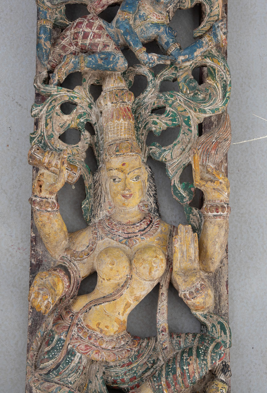 Holz, durchbrochen geschnitten und farbig gefasst. Im Dekorfeld mit Ranken tanzende Shiva und Shakti übereinander auf einem doppelten Lotossockel. HxBxT: je. ca. 183 x 30 x 9 cm.