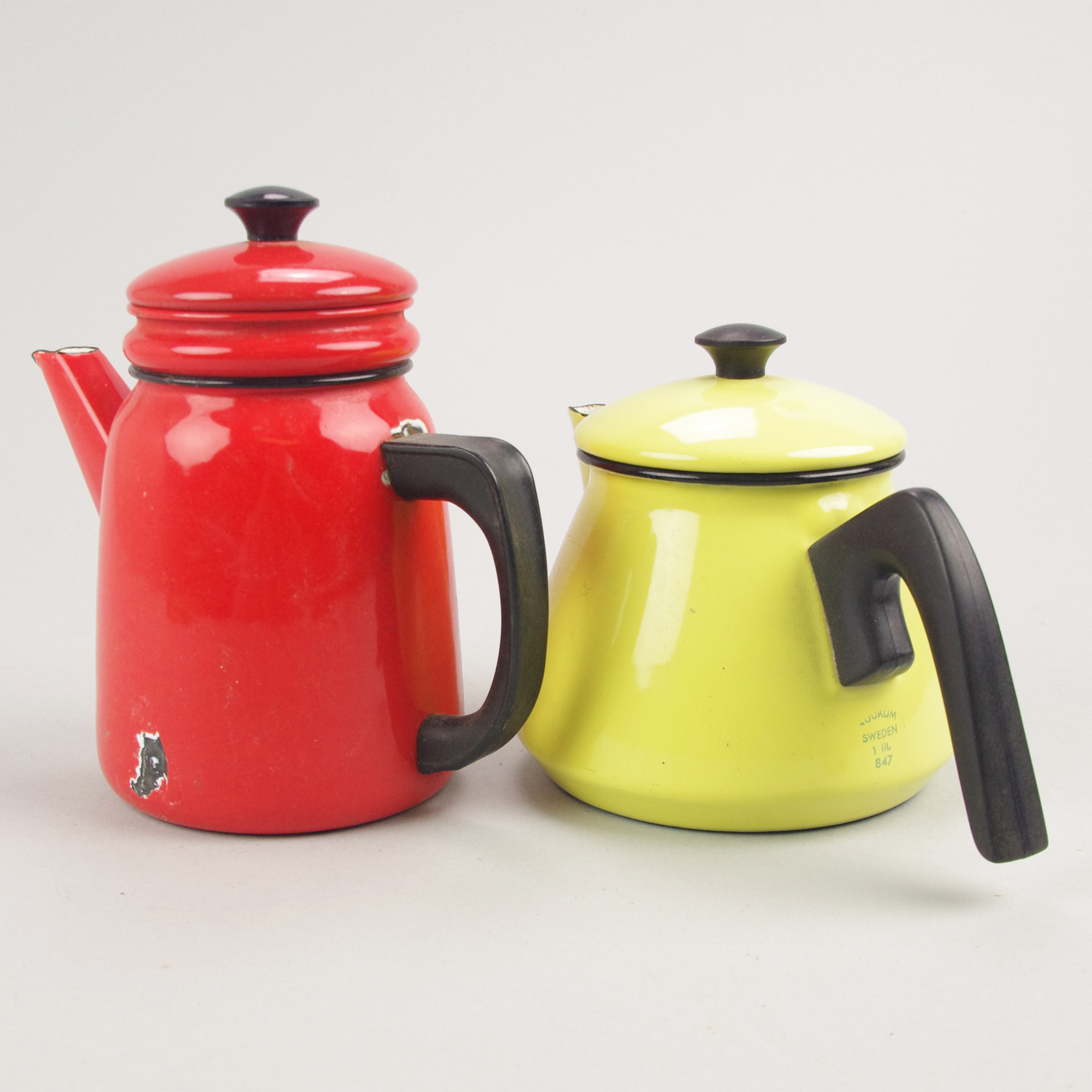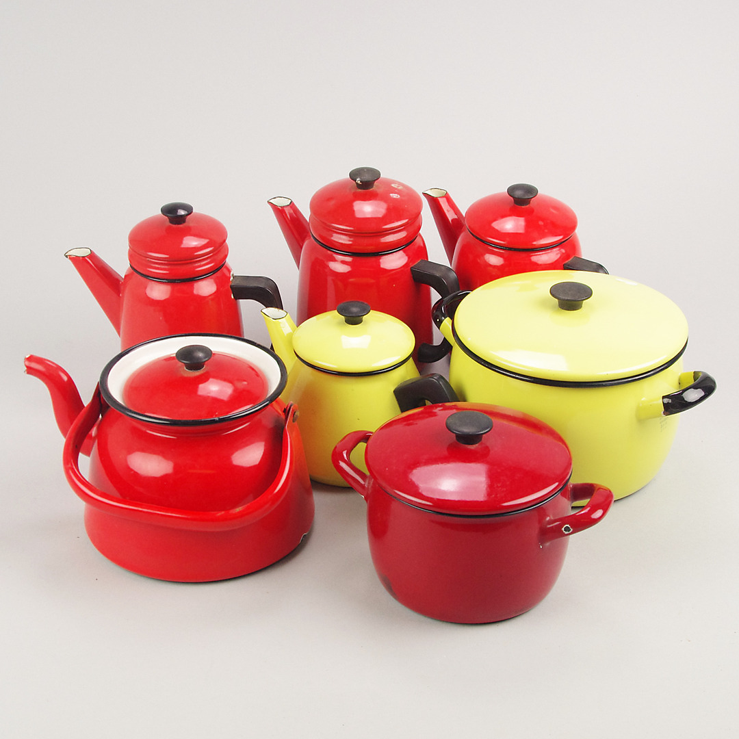 366002. Krüge und Töpfe, 7 Teile, emailliert, Kockums.