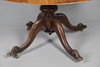 Die ovale viertelfurnierte Kippspitze über einer geschnitzten und durchbohrten rollenden Balustersäule bis zu vier blattgeschnitzten Walmbeinen auf Messingrollen. Höhe 69 cm, Breite 130 cm x 99 cm.