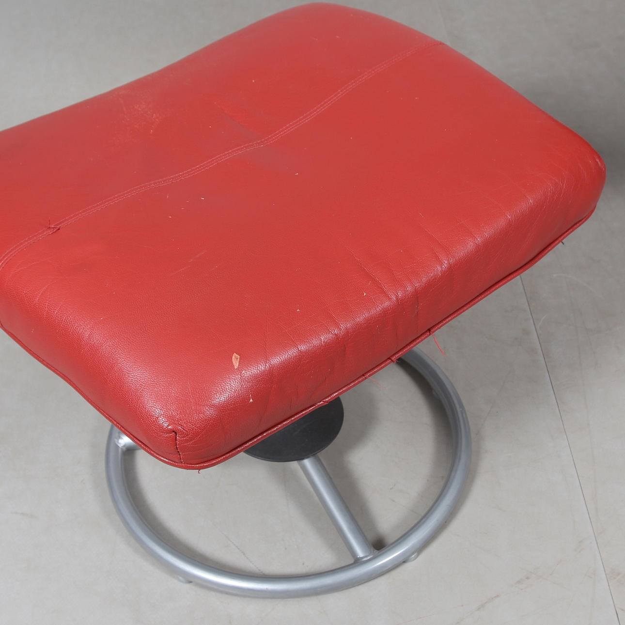 Die Rückseite ist verstellbar. Gestell aus grau lackiertem Metall, gepolsterter Sitz und Rückenlehne, bezogen mit burgunderfarbenem Leder.