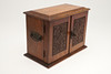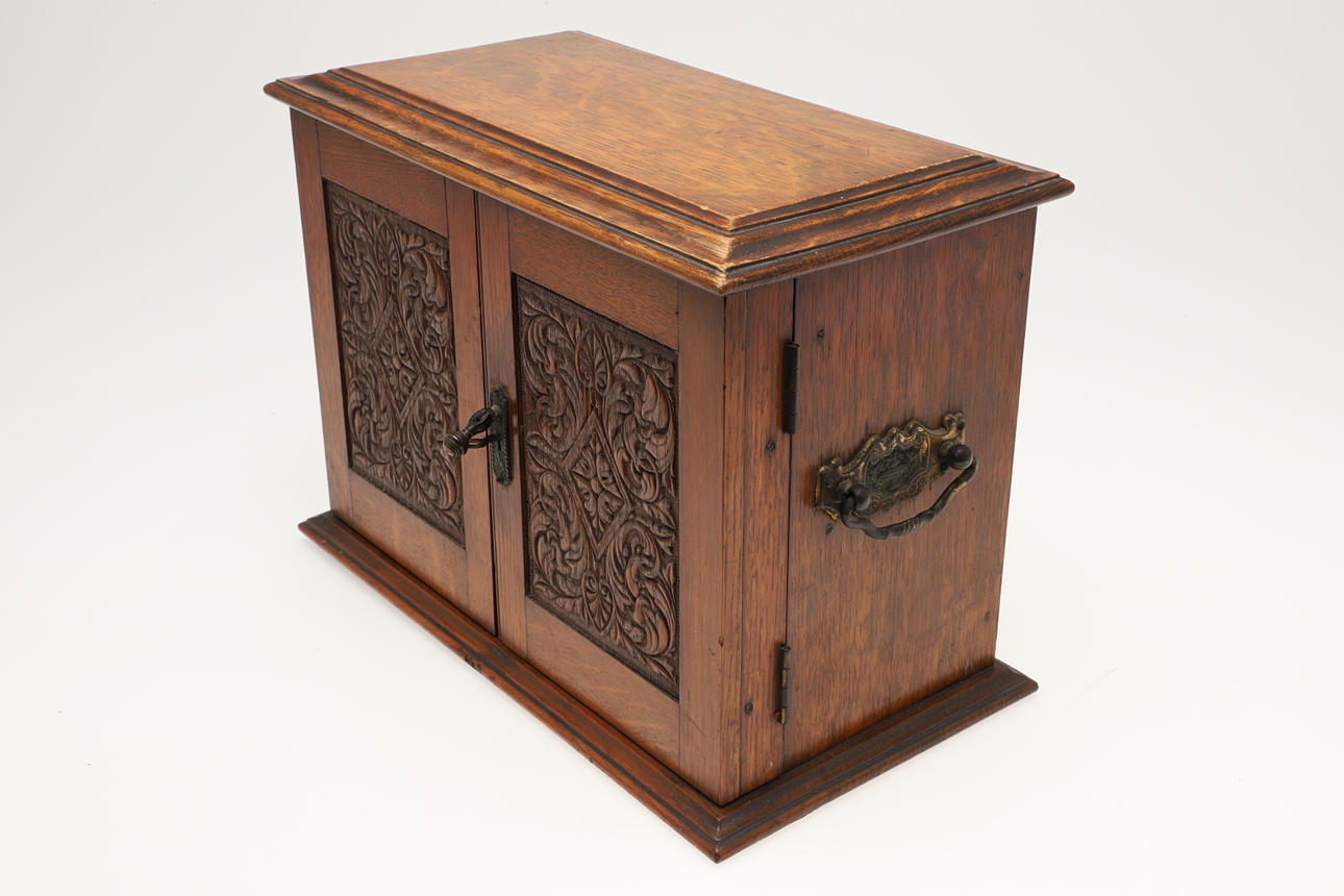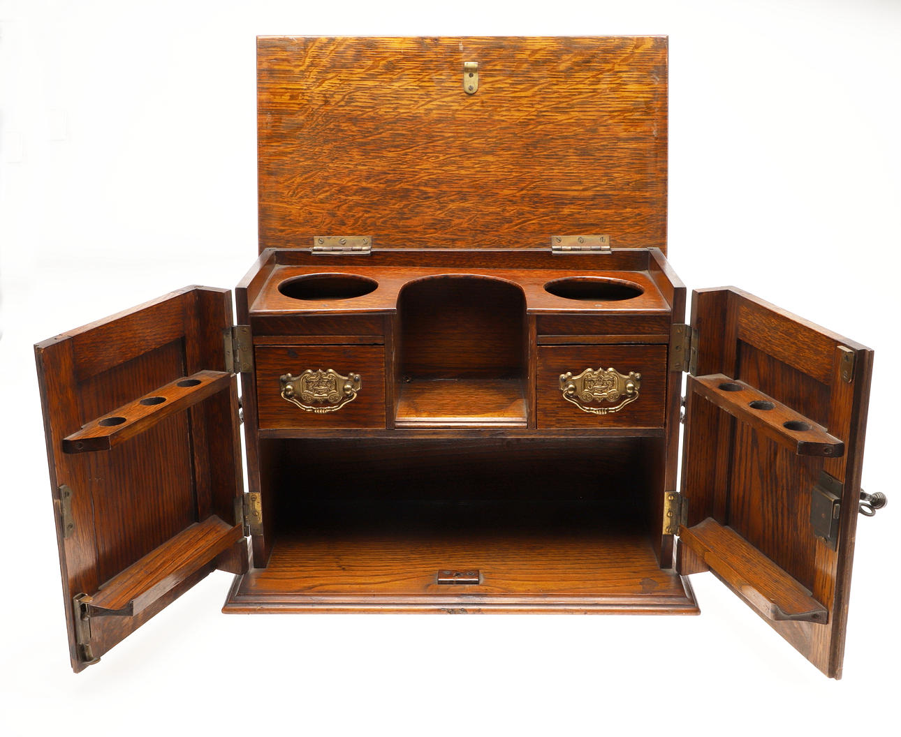 Der Eichenschrank mit Hubdeckel, Fächern für Pfeifen, Tabakdosen und zwei kleinen Schublade. 27,5 cm hoch, 36 cm breit.