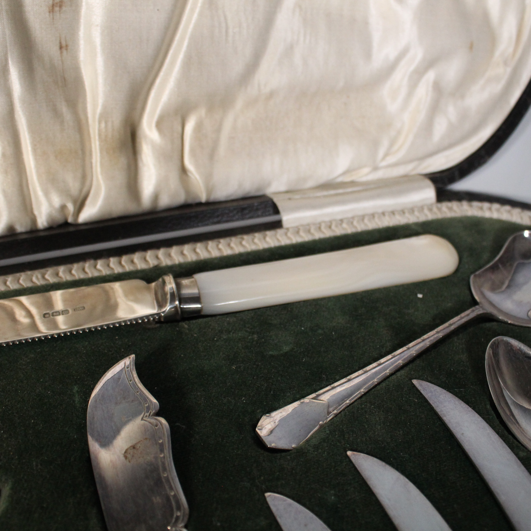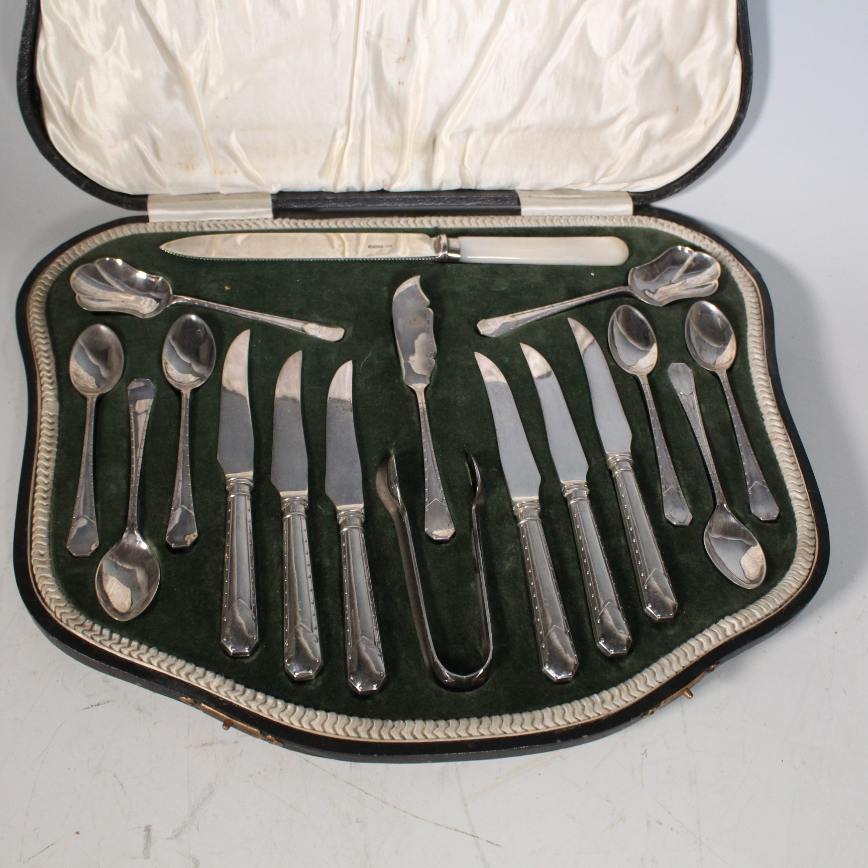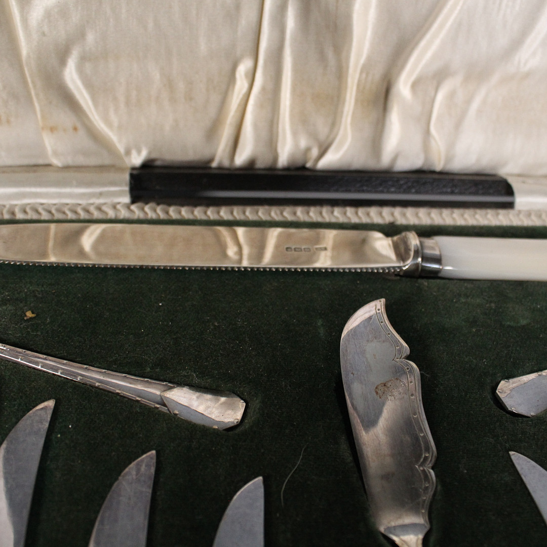 3669819. BEAVERS LTD. GOLDSMITH. Silberbesteck mit Perlmutt im Kasten.