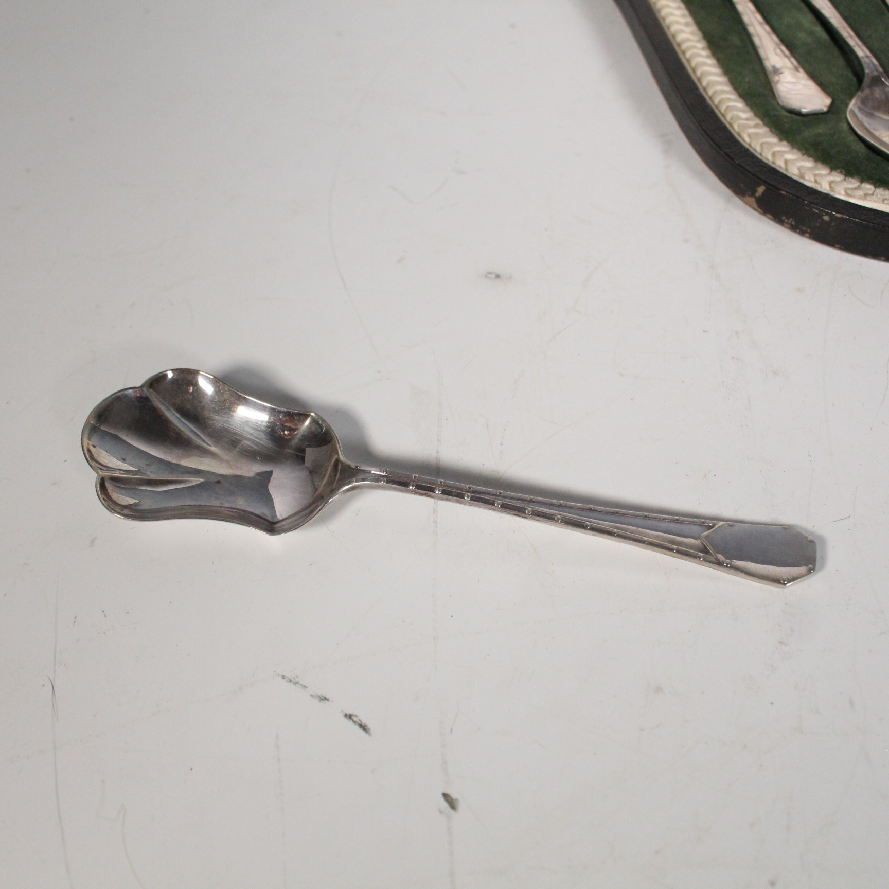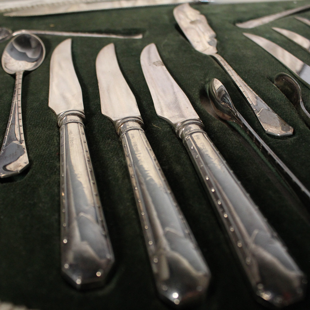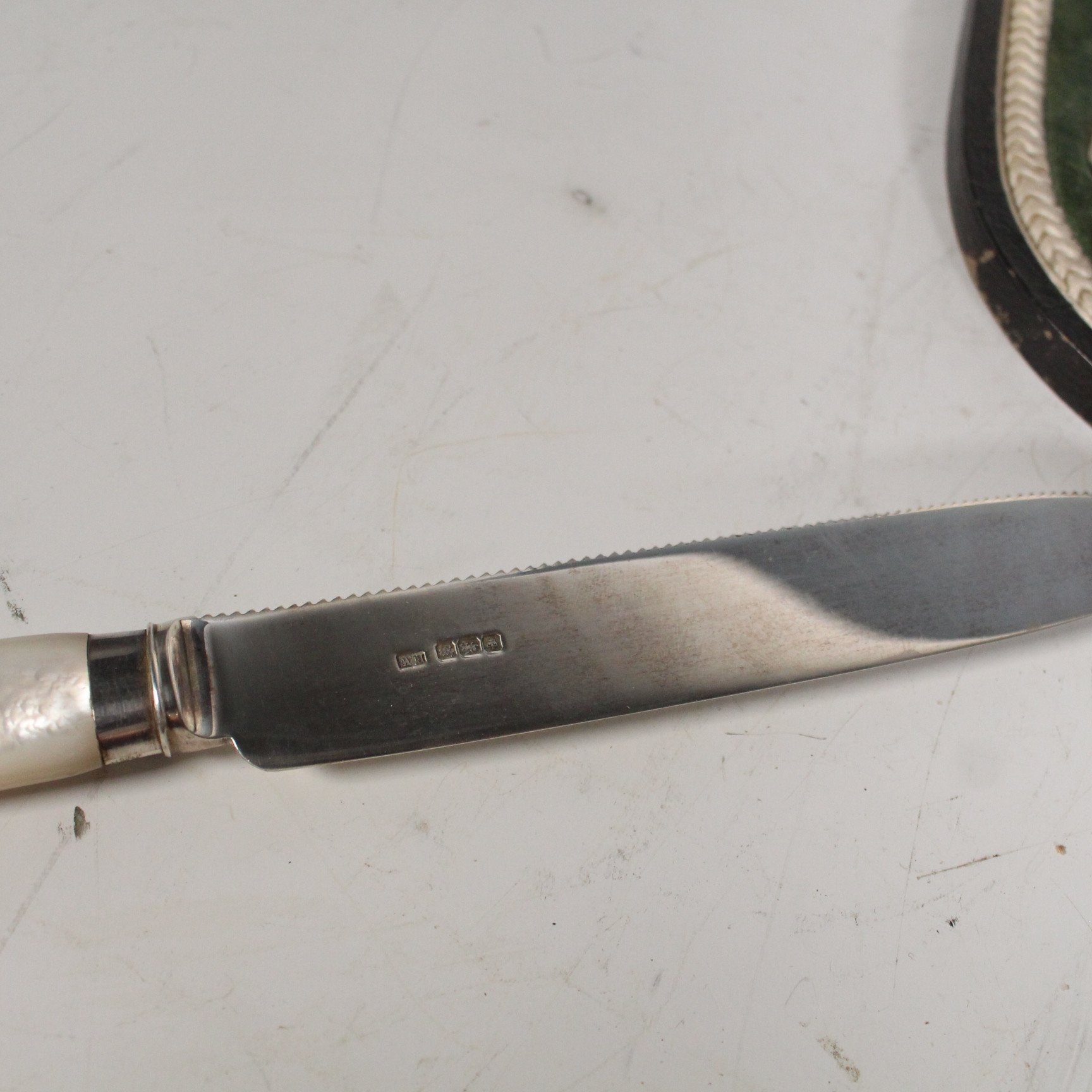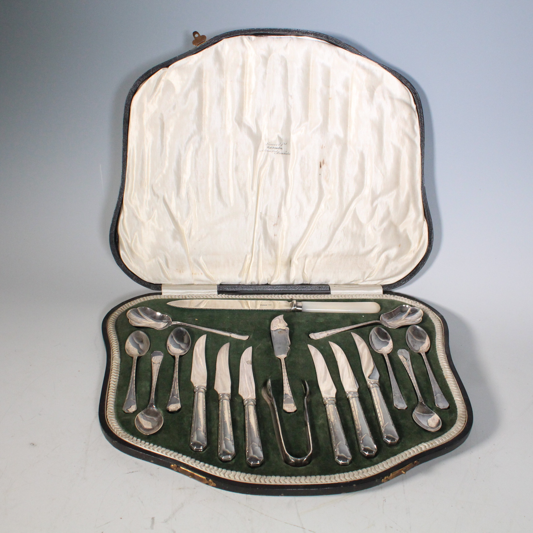 3669819. BEAVERS LTD. GOLDSMITH. Silberbesteck mit Perlmutt im Kasten.