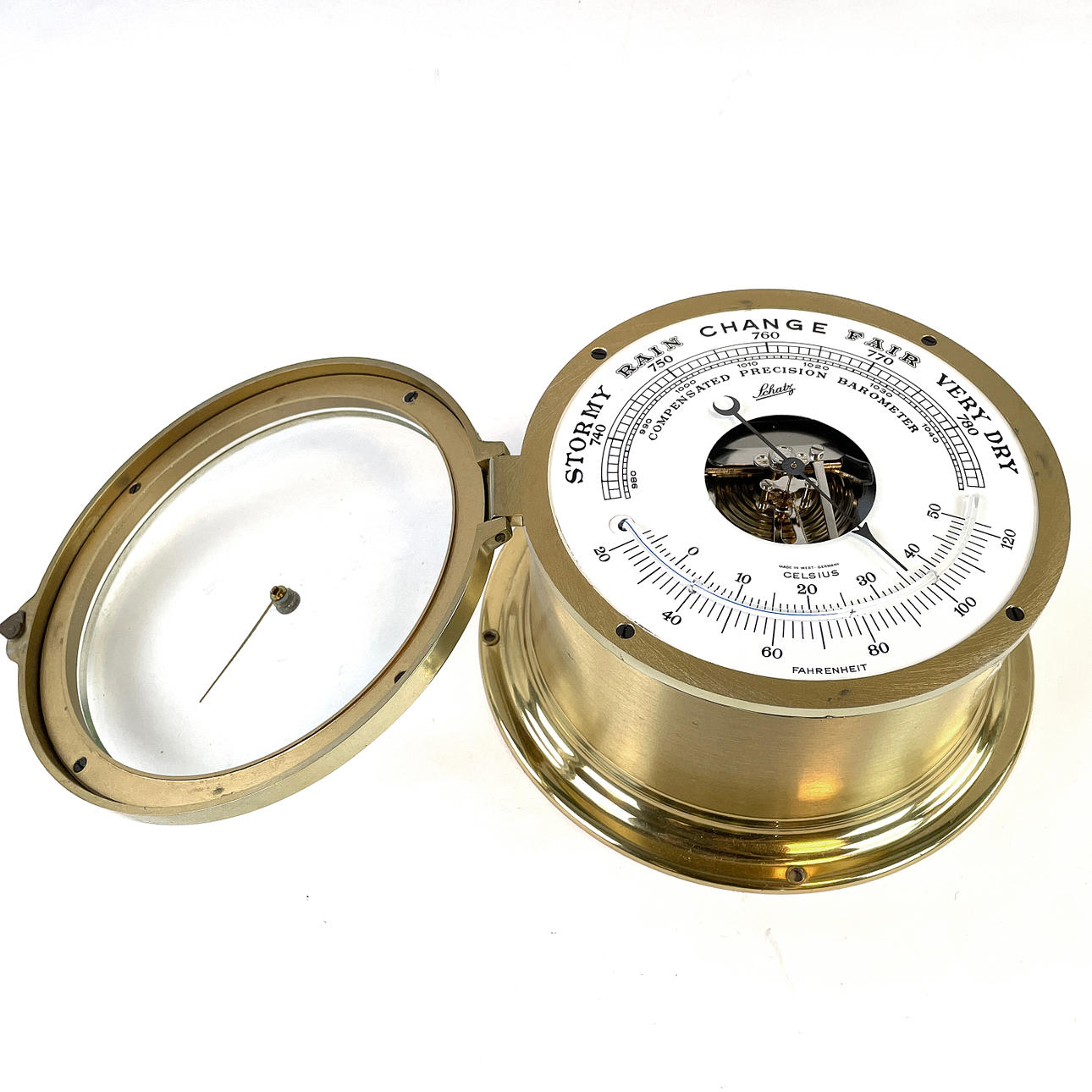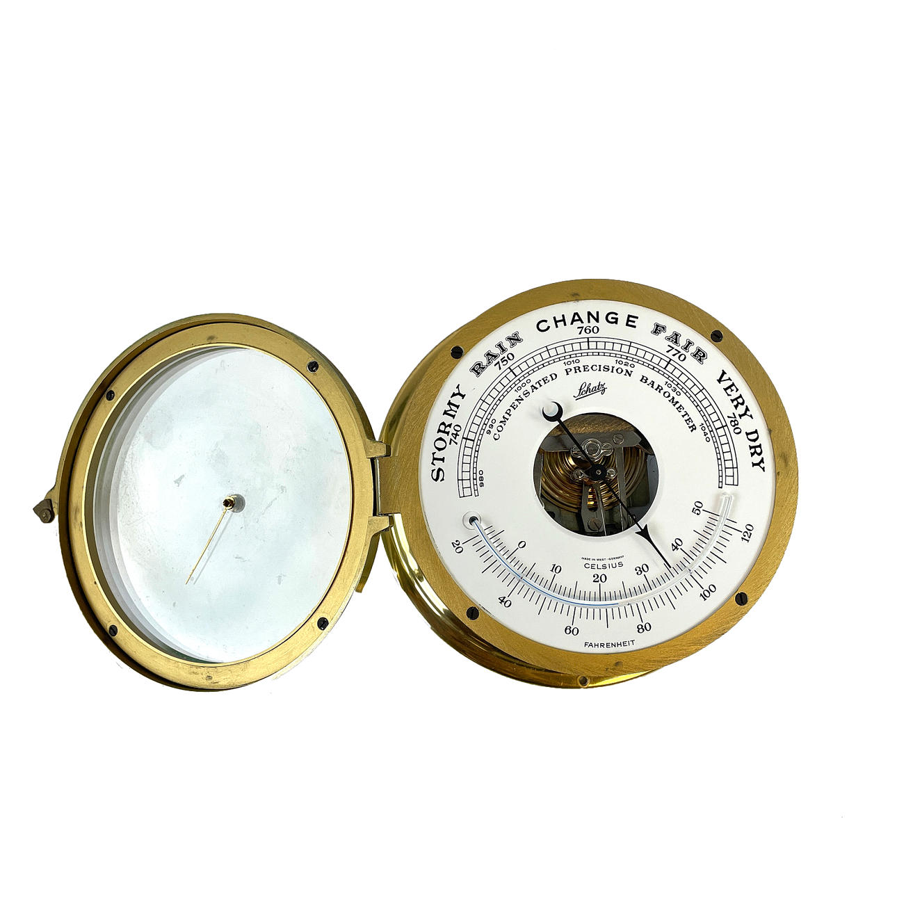 3669933. Eine Messinguhr und ein Barometer von Schatz, Deutschland.