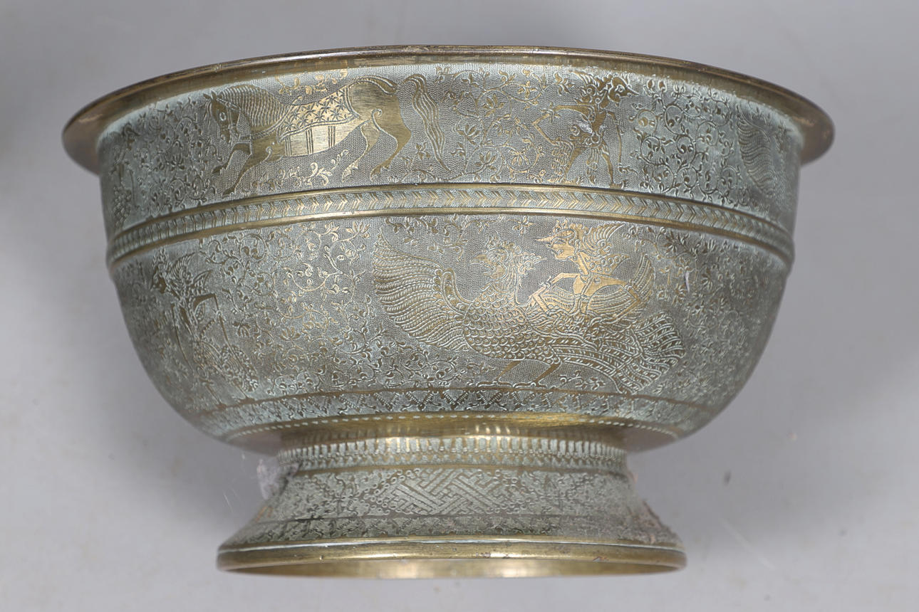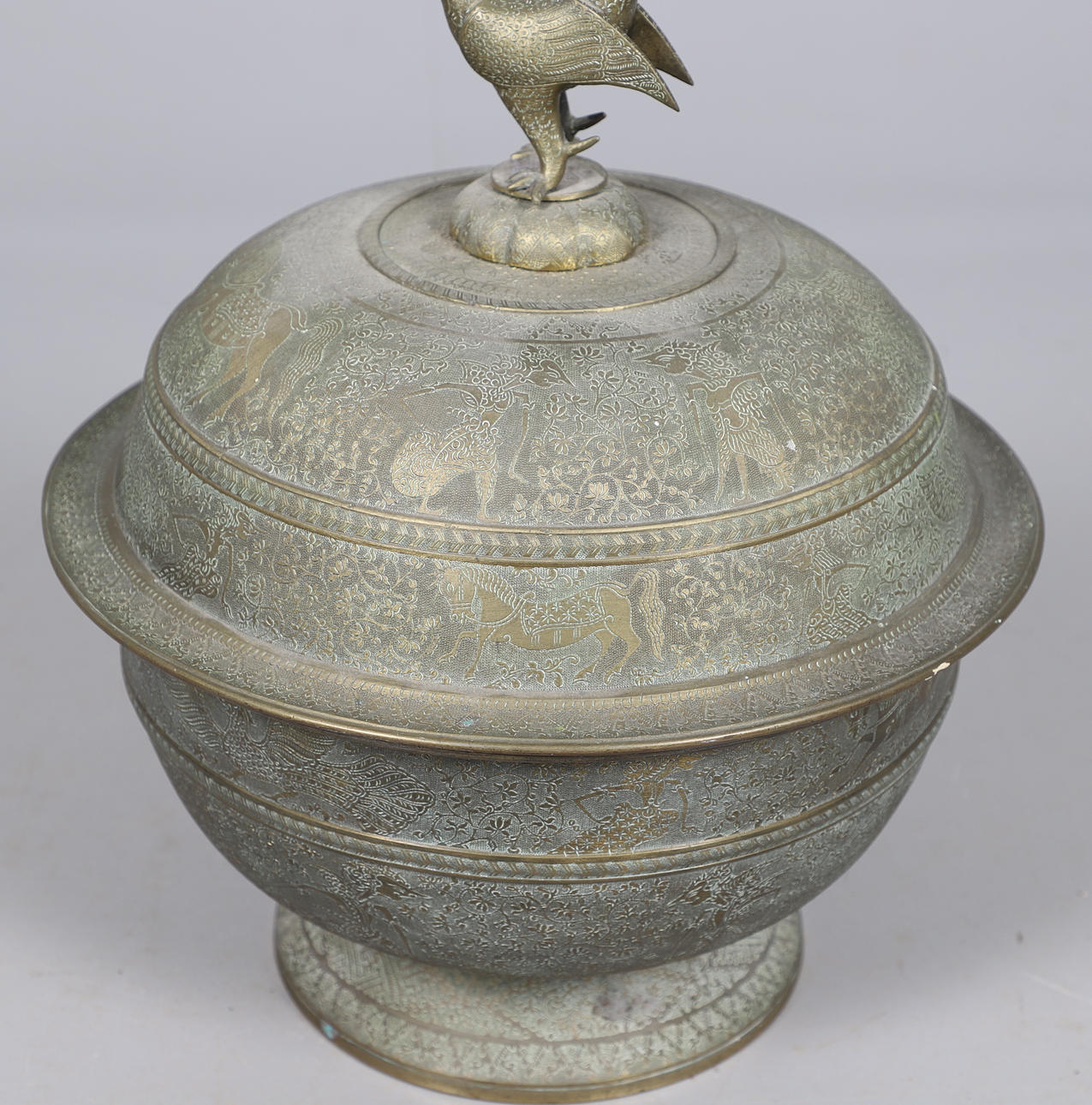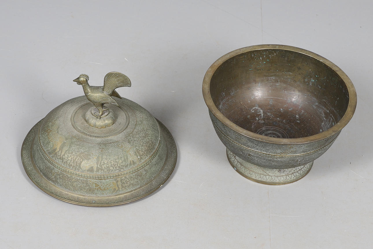 Eine ungewöhnlich große asiatische Schale mit Messingdeckel, mit einem Hahnverschluss am Deckel und dem gewölbten Deckel, mit verschiedenen Figuren, Tieren, Vögel und Laub im Flachrelief. 42 cm hoch.