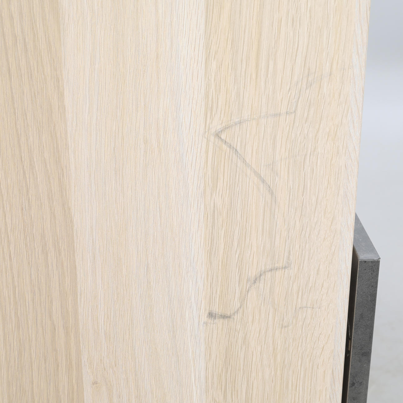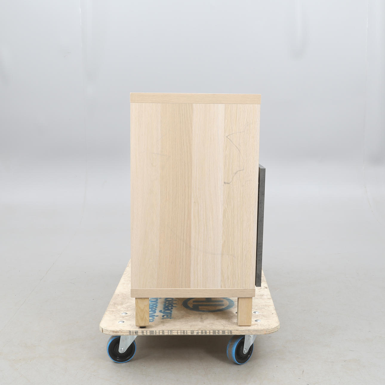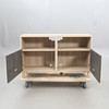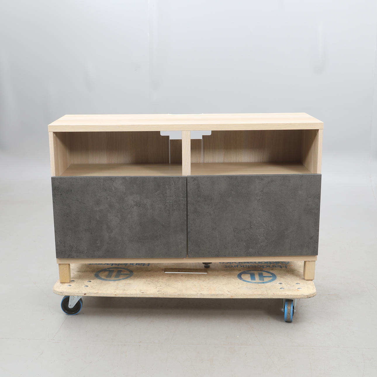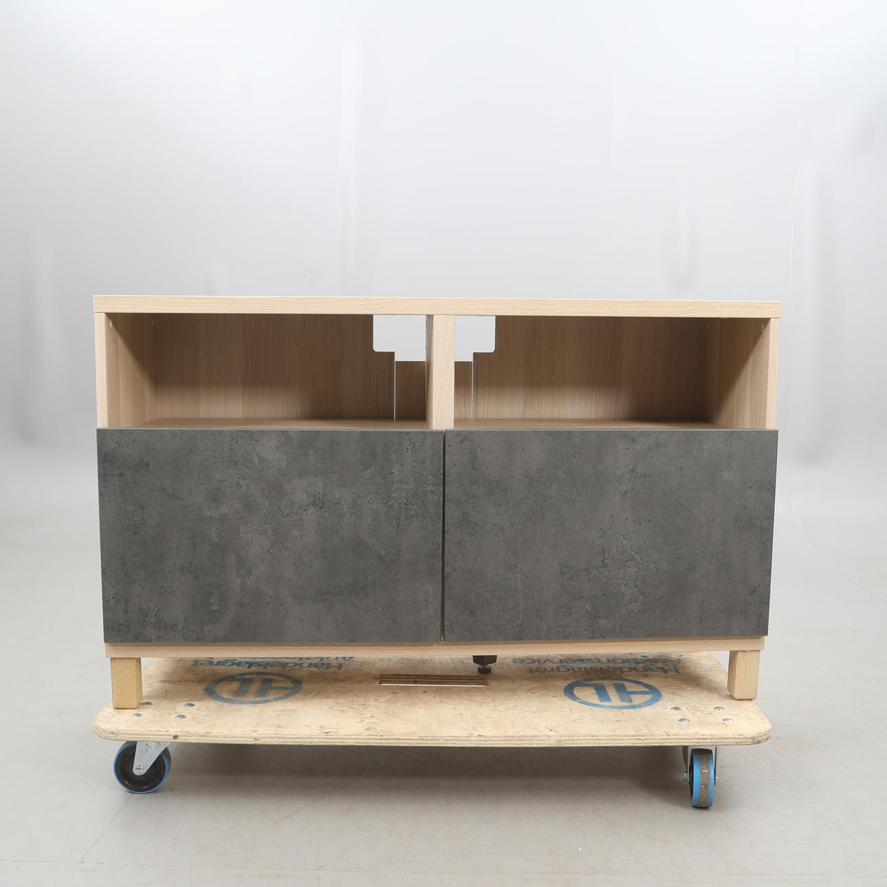TV-Bank, mit Türen, weiß verglast, Türen aus dunkelgrauem Beton gemustert.