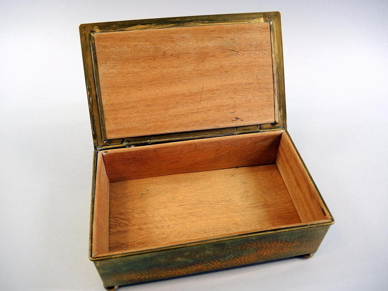 Zigarrendose, Messing, Auerhahn auf dem Deckel, deutsch, um 1910, H x B x T ca. 7,5 x 24 x 15 cm.