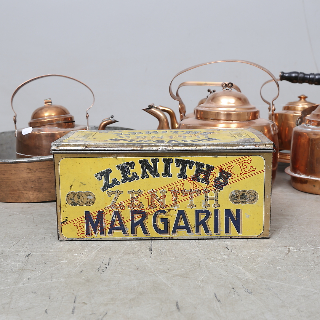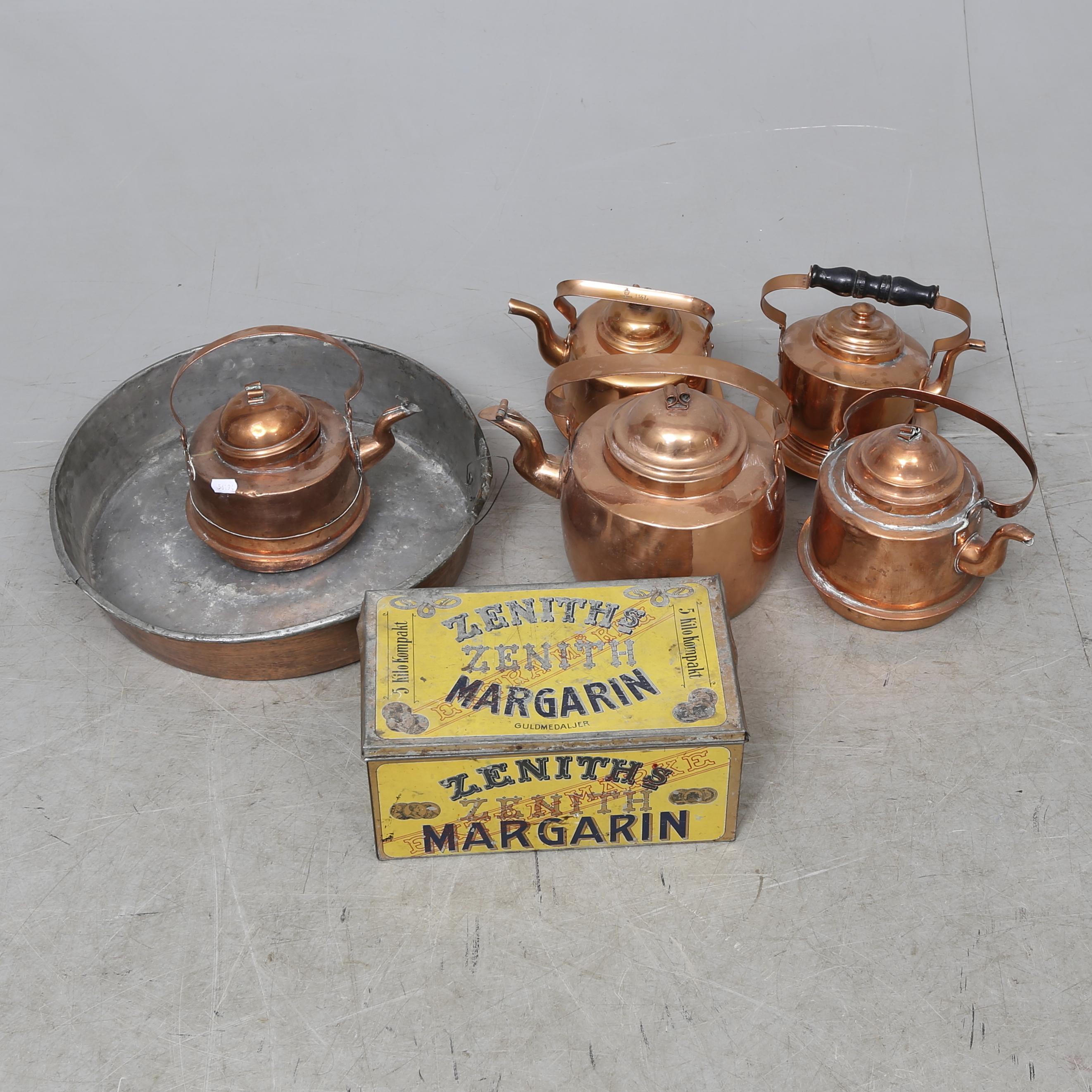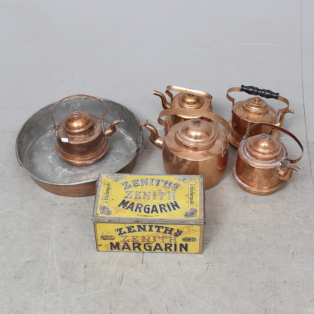 368719. KUPFERGEGENSTÄNDE und BLECHDOSE, 7 Teile.