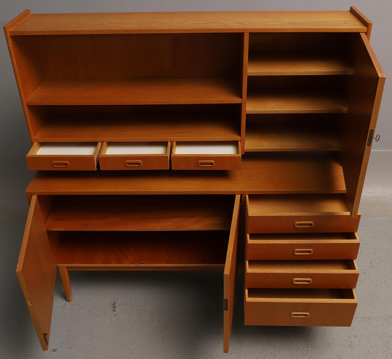 Zweiteilig. Gesamthöhe: ca. 148 cm Breite: ca. 150 cm Tiefe: ca. 45 cm.