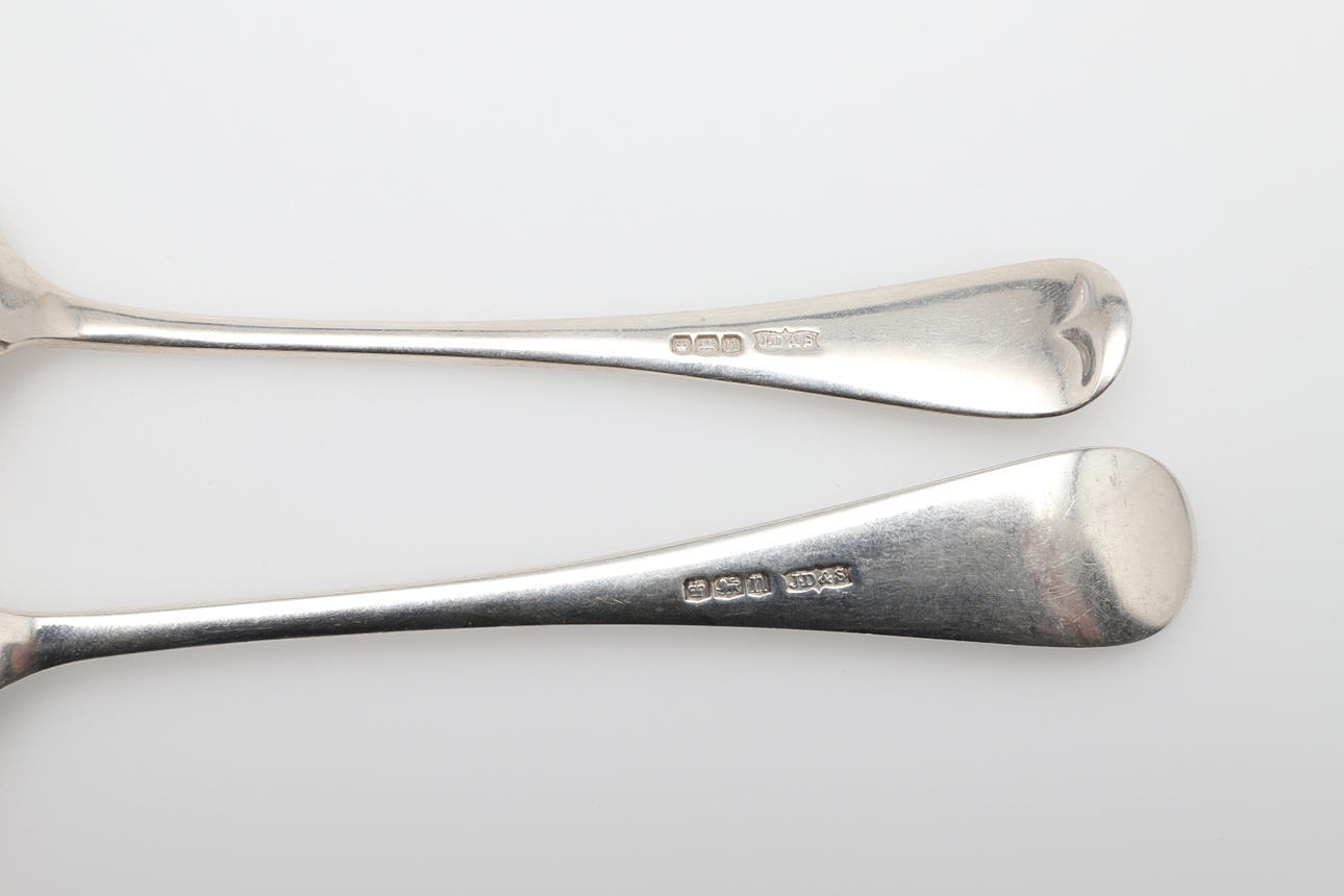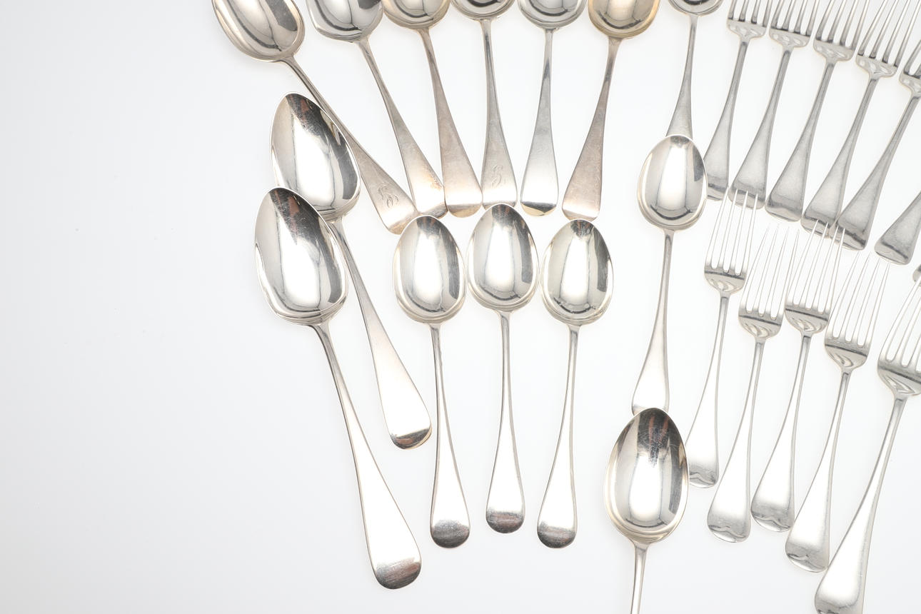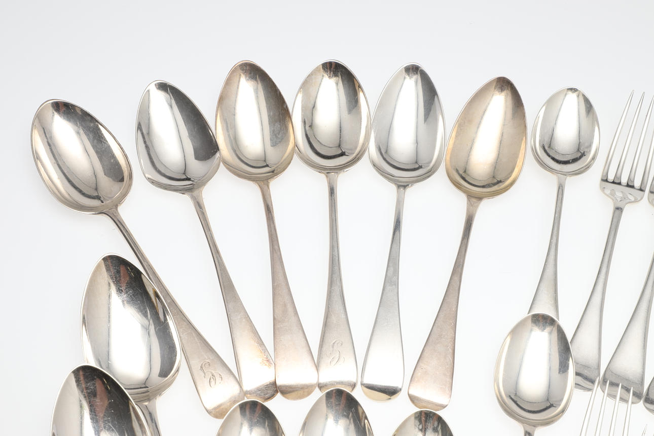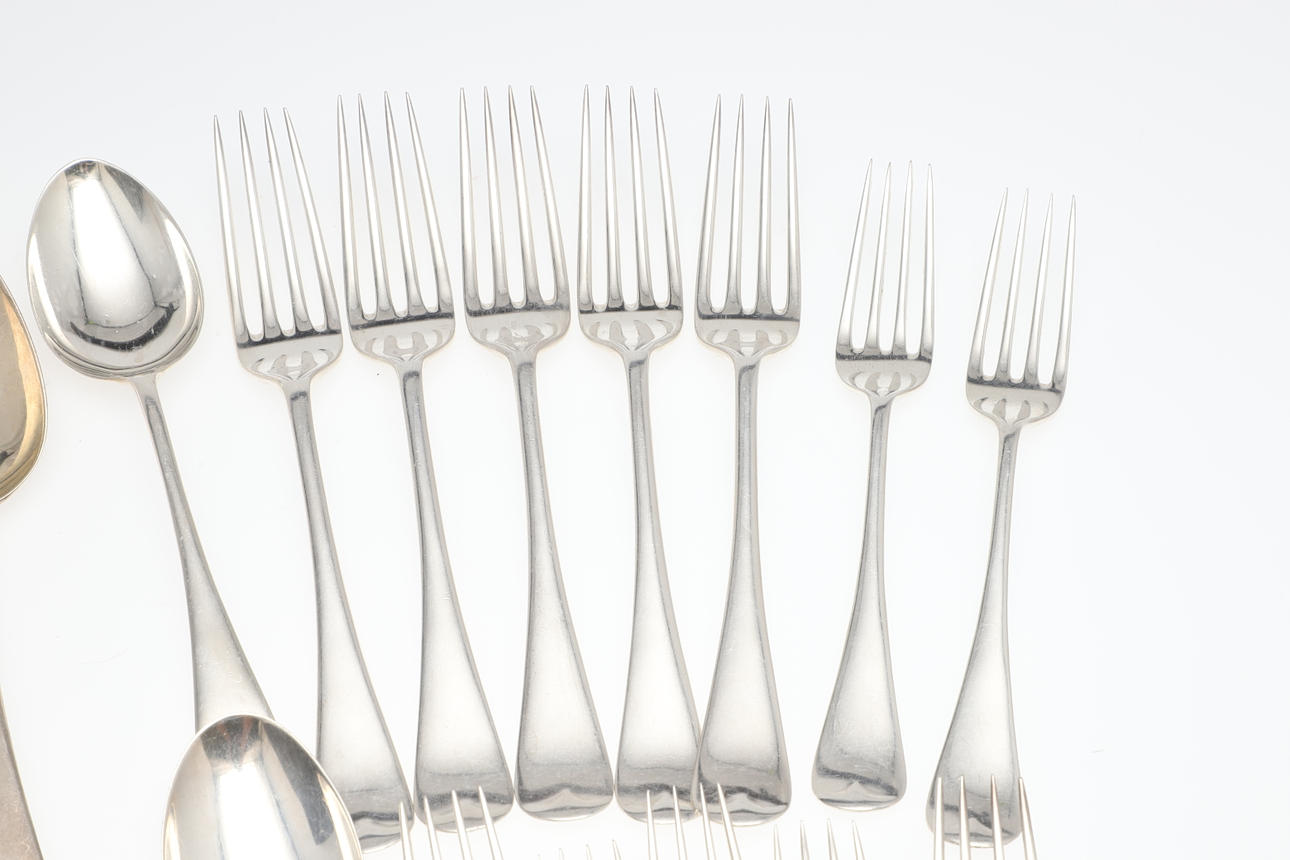 inklusive 8 Esslöffeln, 6 Tafelgabeln, 6 Dessertlöffeln und 6 Dessertgabeln, hauptsächlich von James Dixon & Sons Ltd, Sheffield 1930/31 (die Esslöffel früher und von verschiedenen Herstellern und Daten); 47ozt (26).