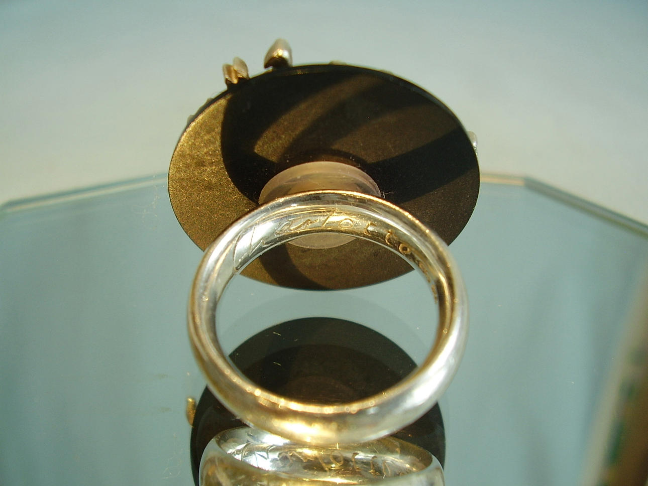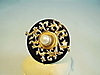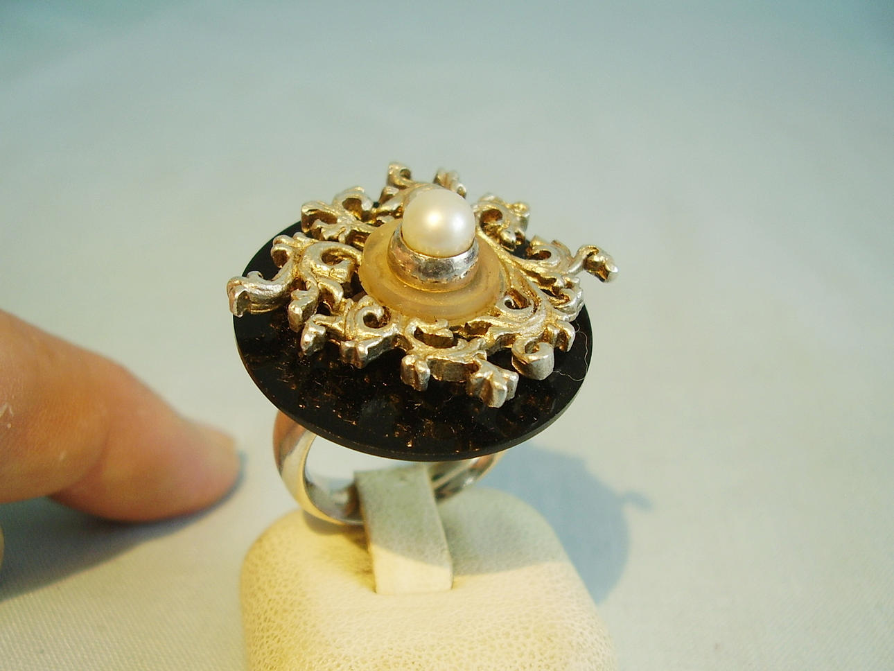 Ringkopf besetzt mit schwarzer Kunststoff-Scheibe mit durchbrochen gearbeiteter Silberauflage und zentraler echter weißer Zuchtperle 5,2 mm Durchmesser. Alle Teile sind abnehmbar und austauschbar, System-Schmuck.