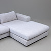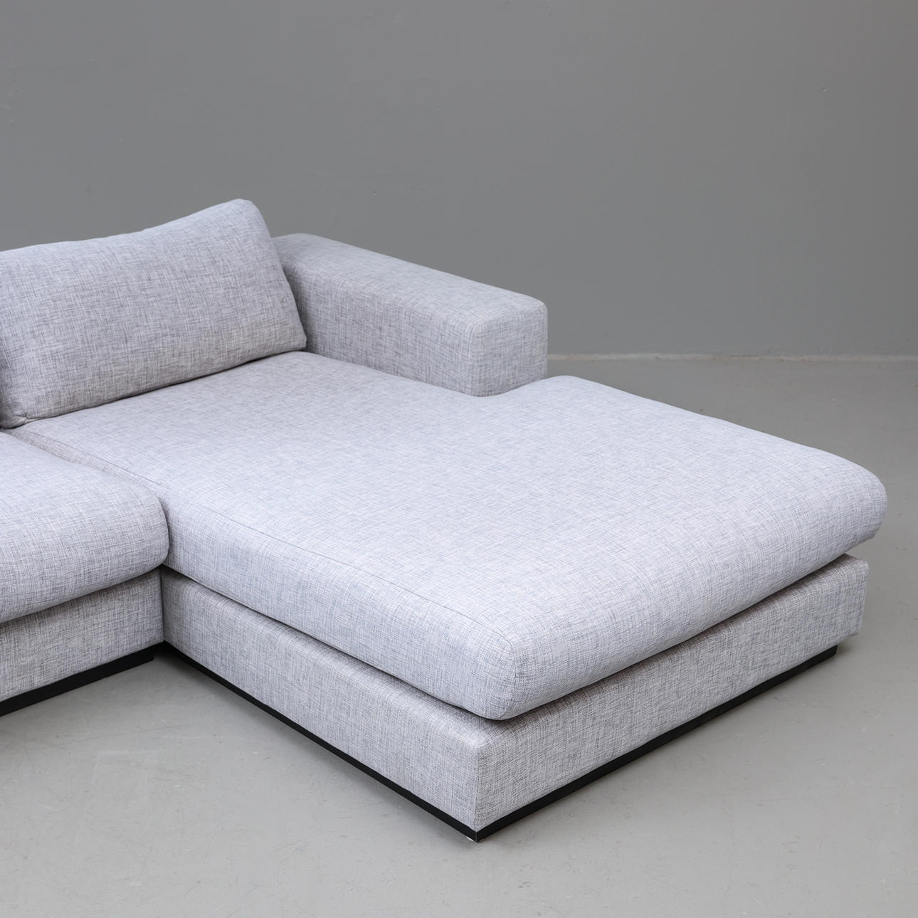 Vollgepolstertes Sofa mit Chaiselongue, bezogen mit grauem Textil, auf einem niedrigen Sockel aus schwarz lasiertem Holz. Beseitigen Sie Sitz- und Rückenschmerzen.