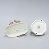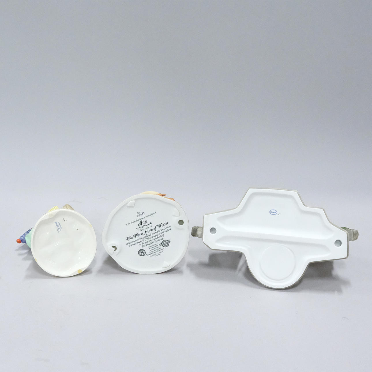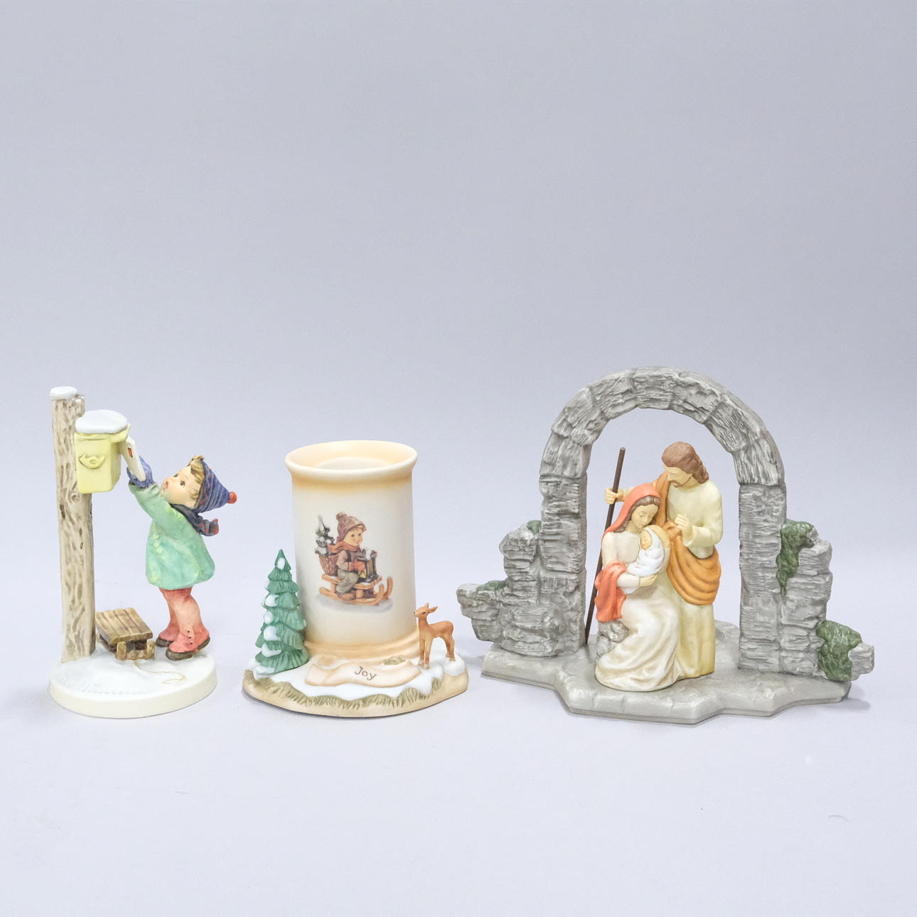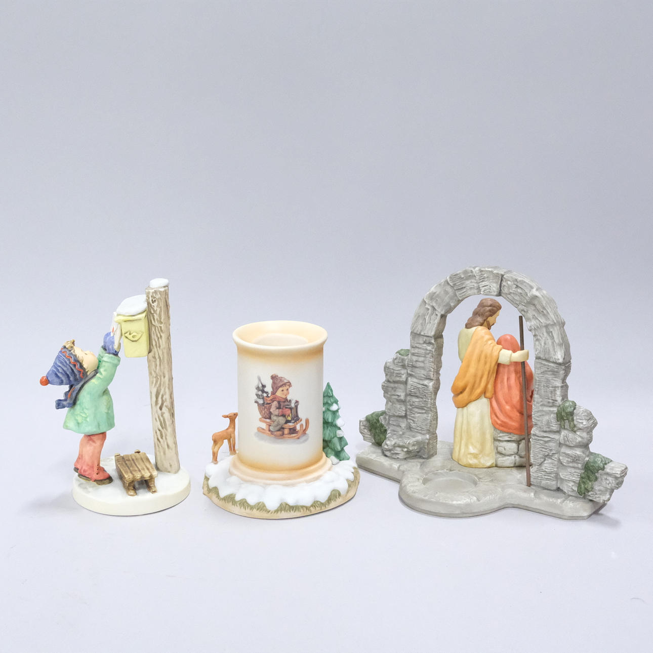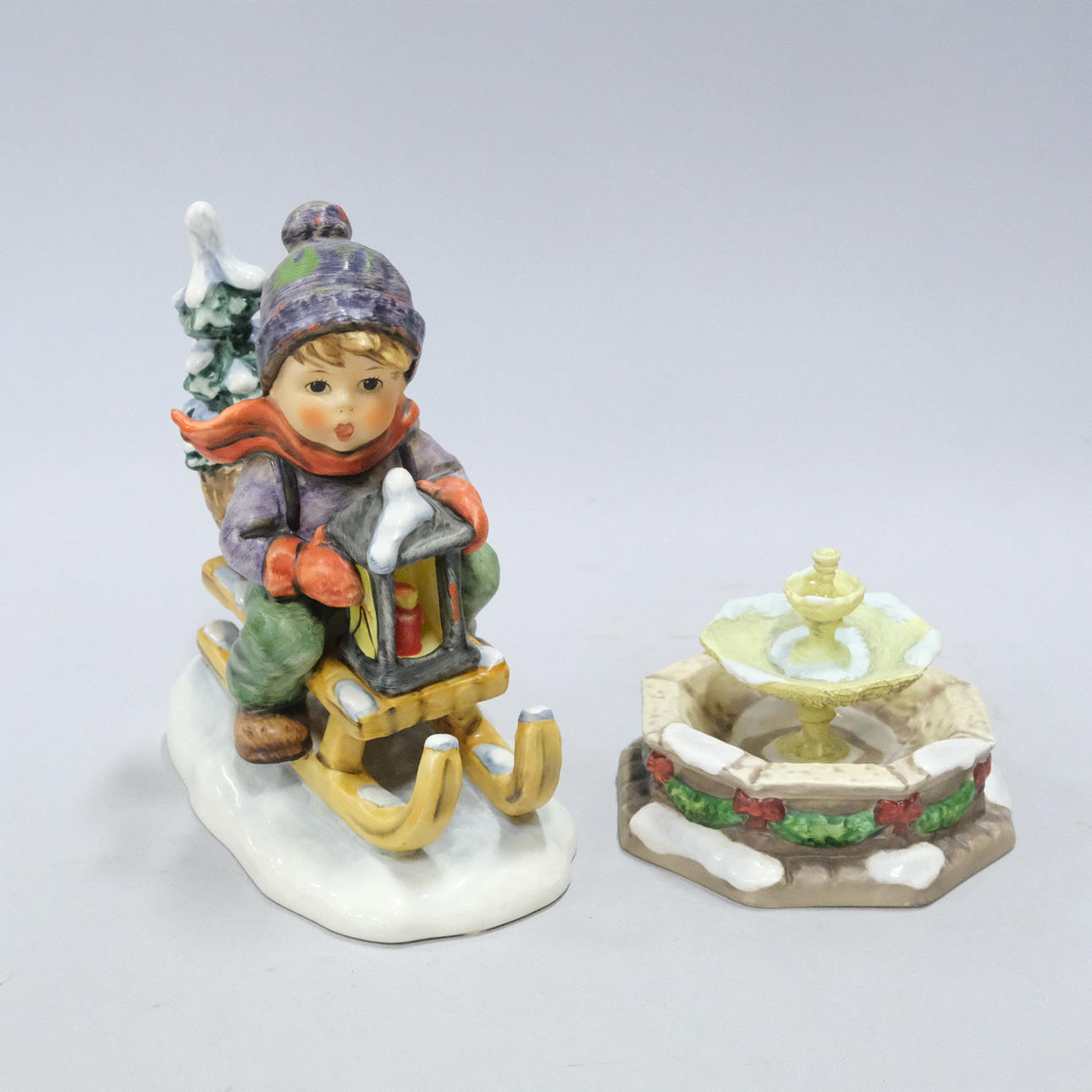 Figur mit Kerzenhalter, Höhe 18,5 cm, Junge auf Rodel, Höhe 15 cm, Junge und Briefkasten, Höhe 18 cm, Kerzenständer mit Weihnachtsmotiv, Höhe 14 cm und Springbrunnen, Höhe 7 cm.