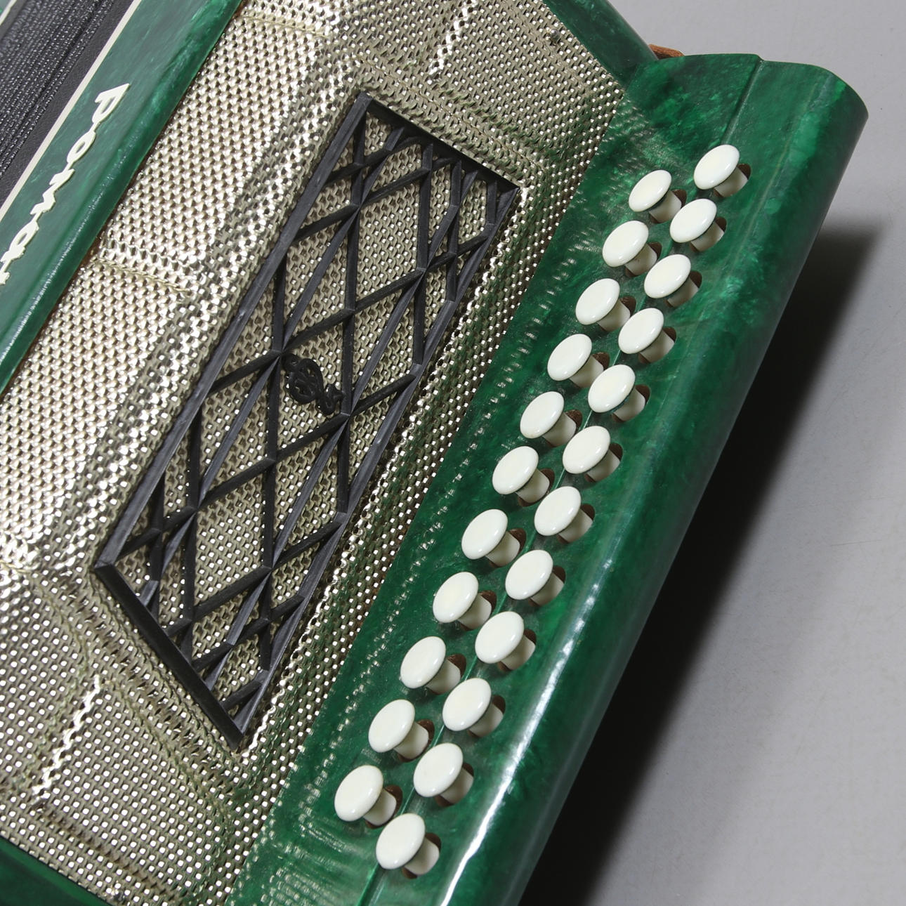 23 Knöpfe in den Höhen und 13 im Bass. Länge 32, Breite 17, Höhe 32 cm.