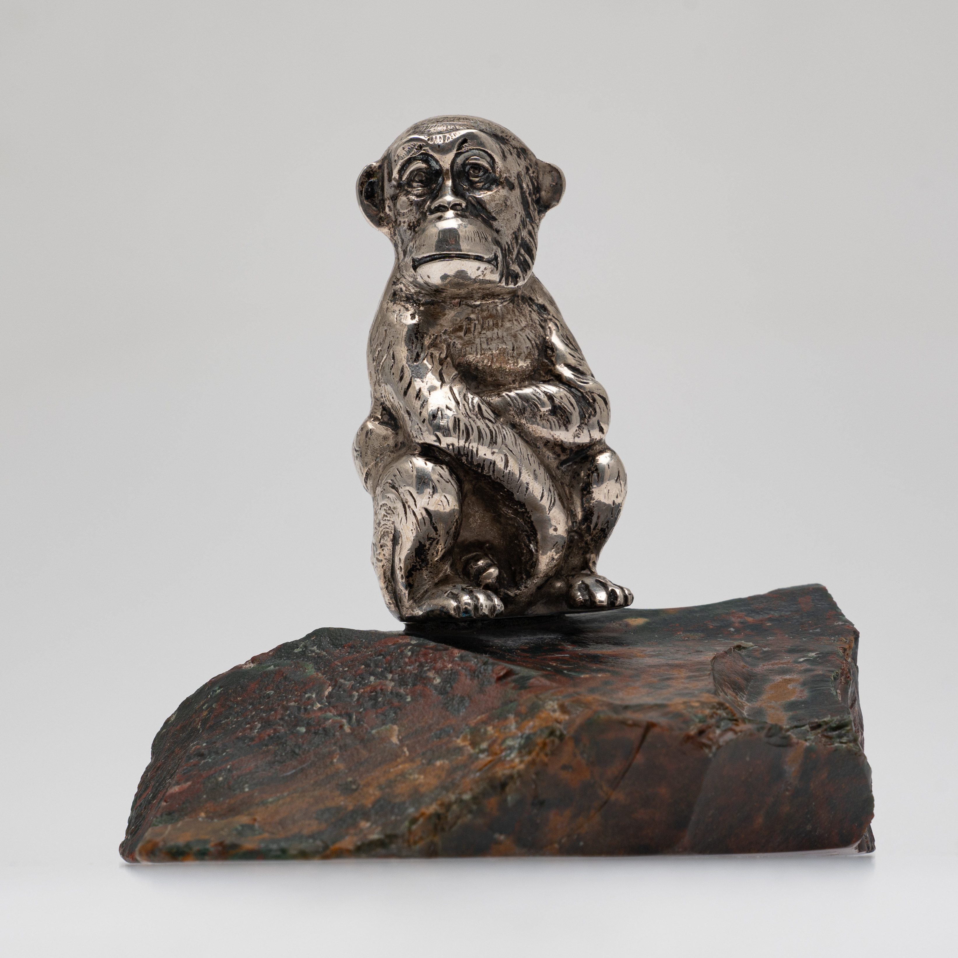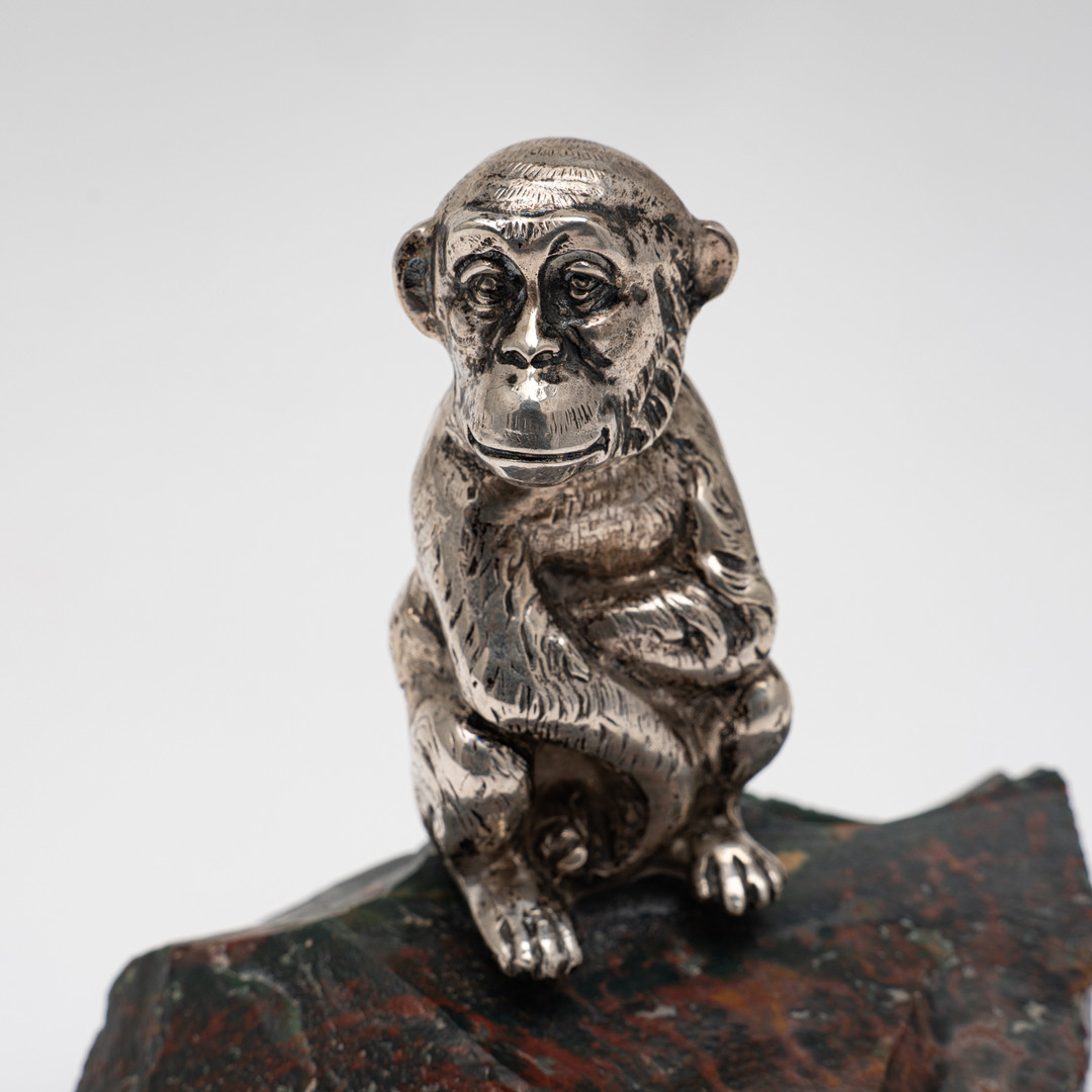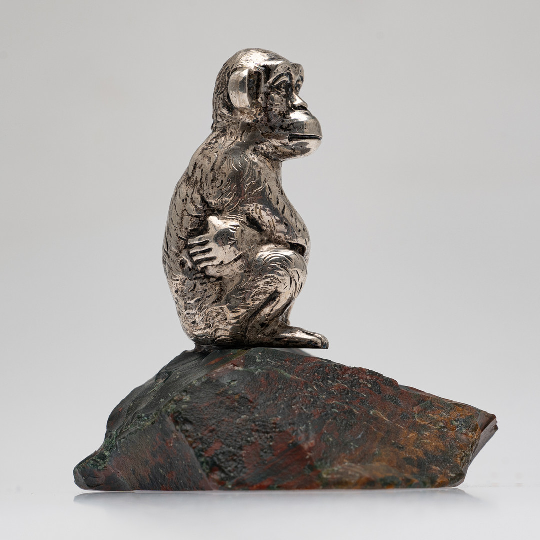 3709470. Art Déco Figur / Skulptur, sitzender Affe, versilbert, Stein.