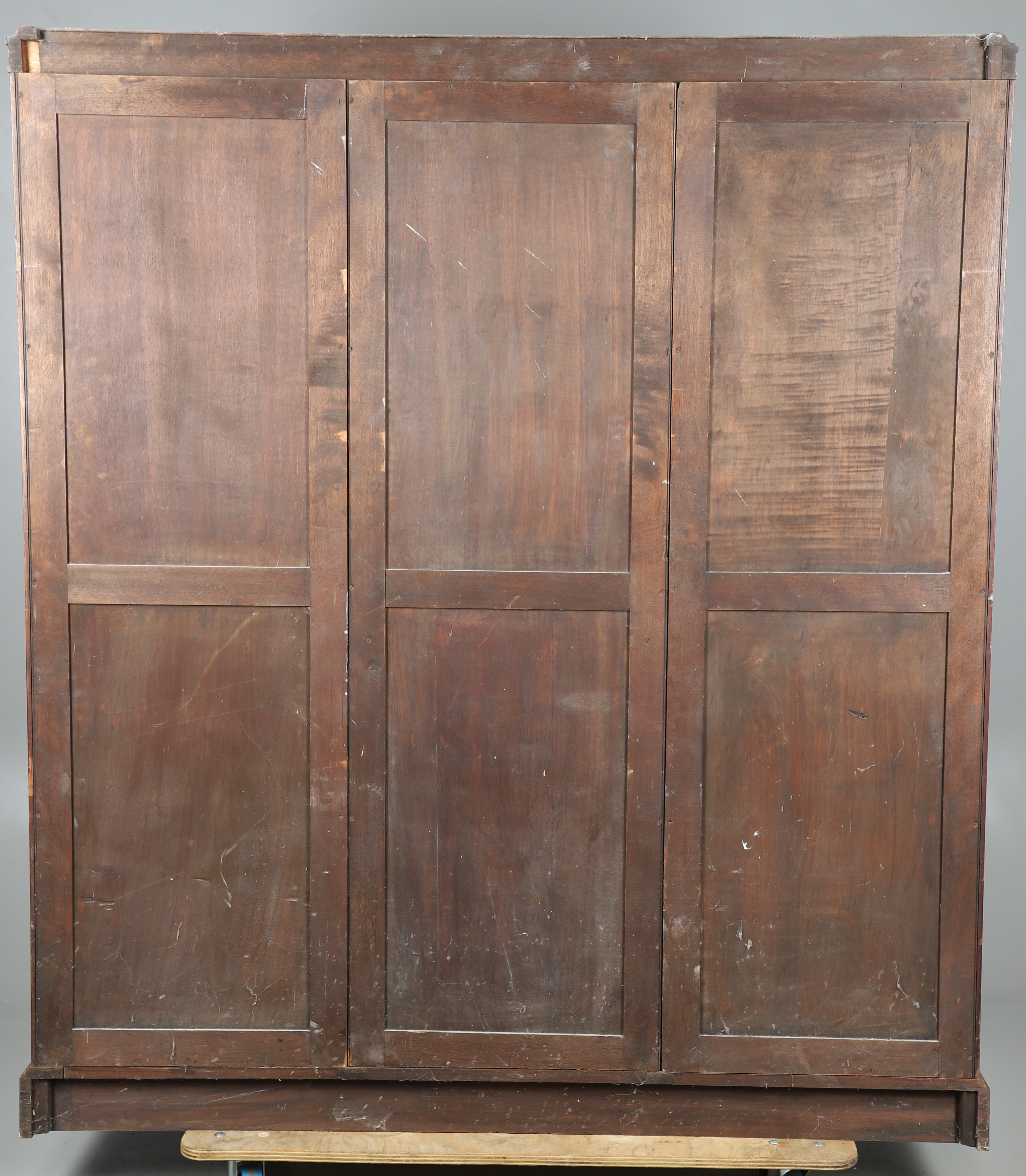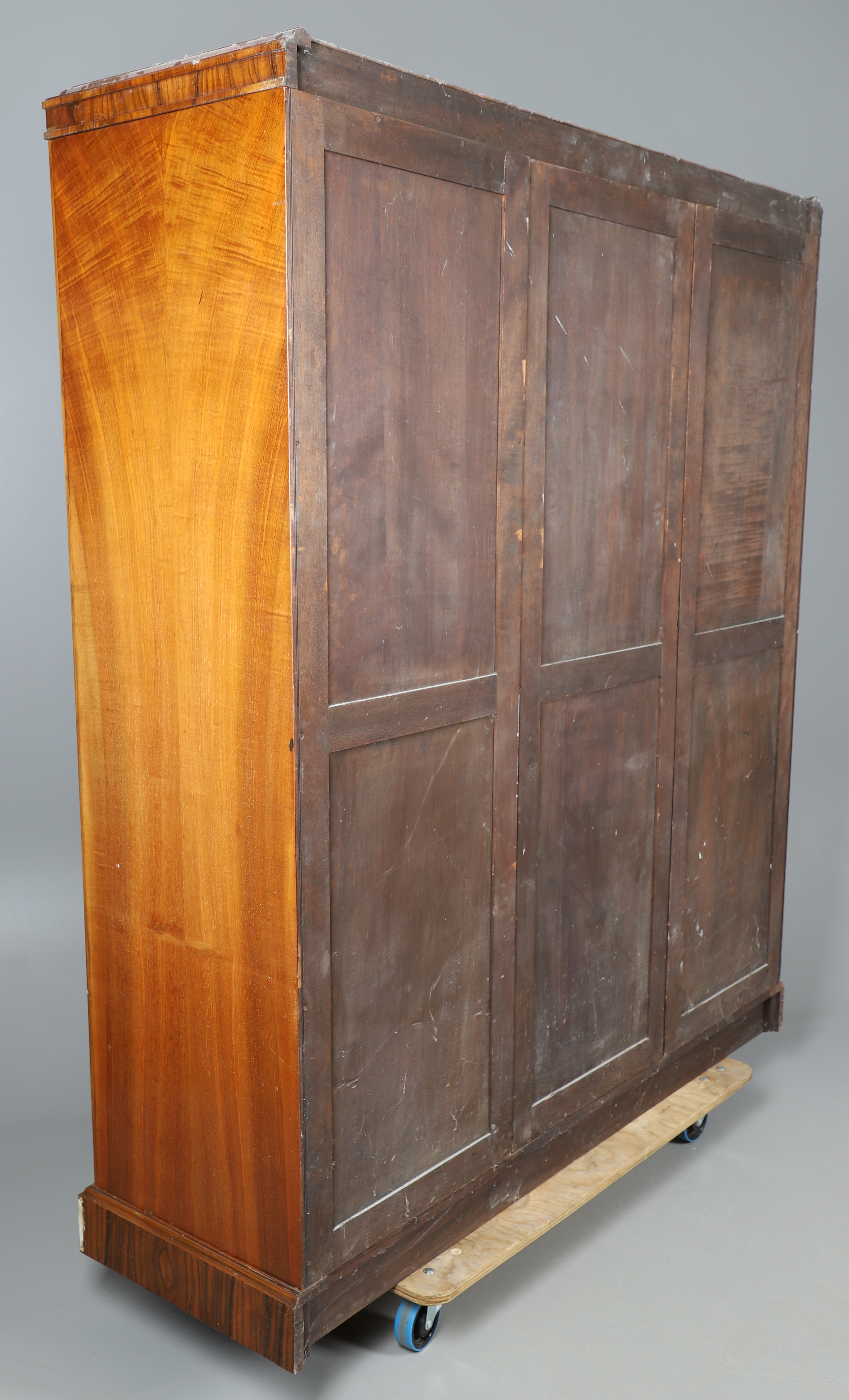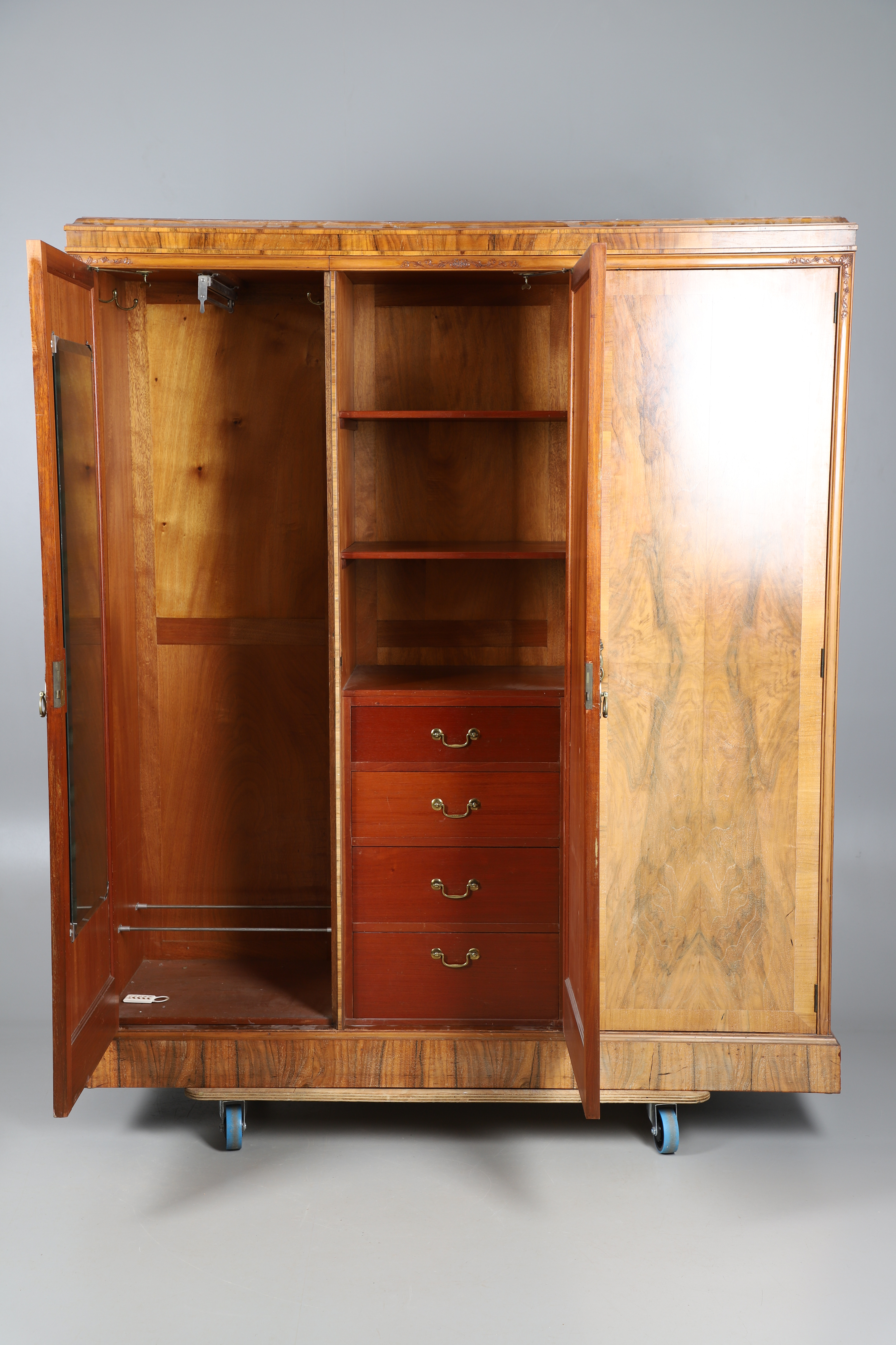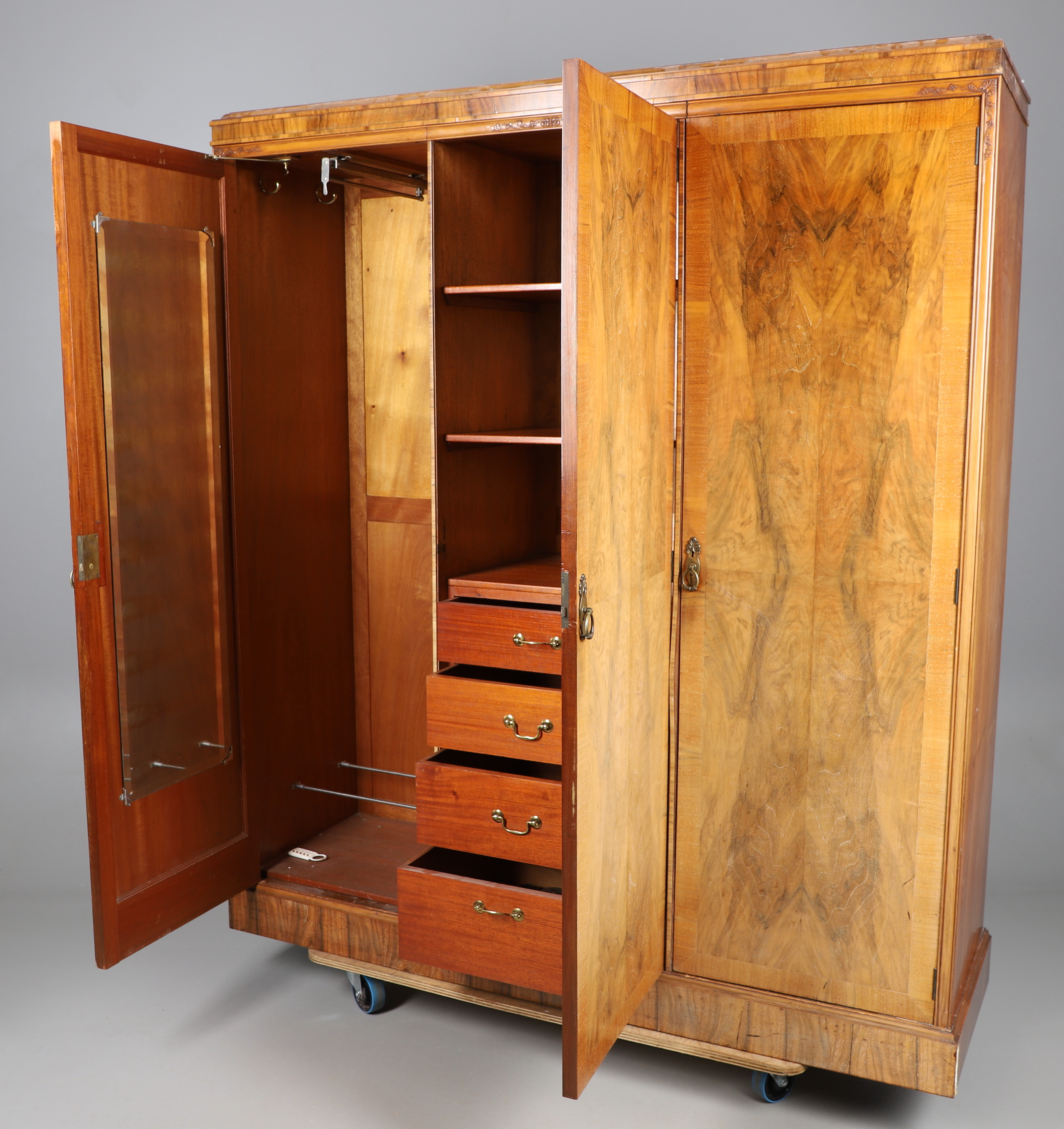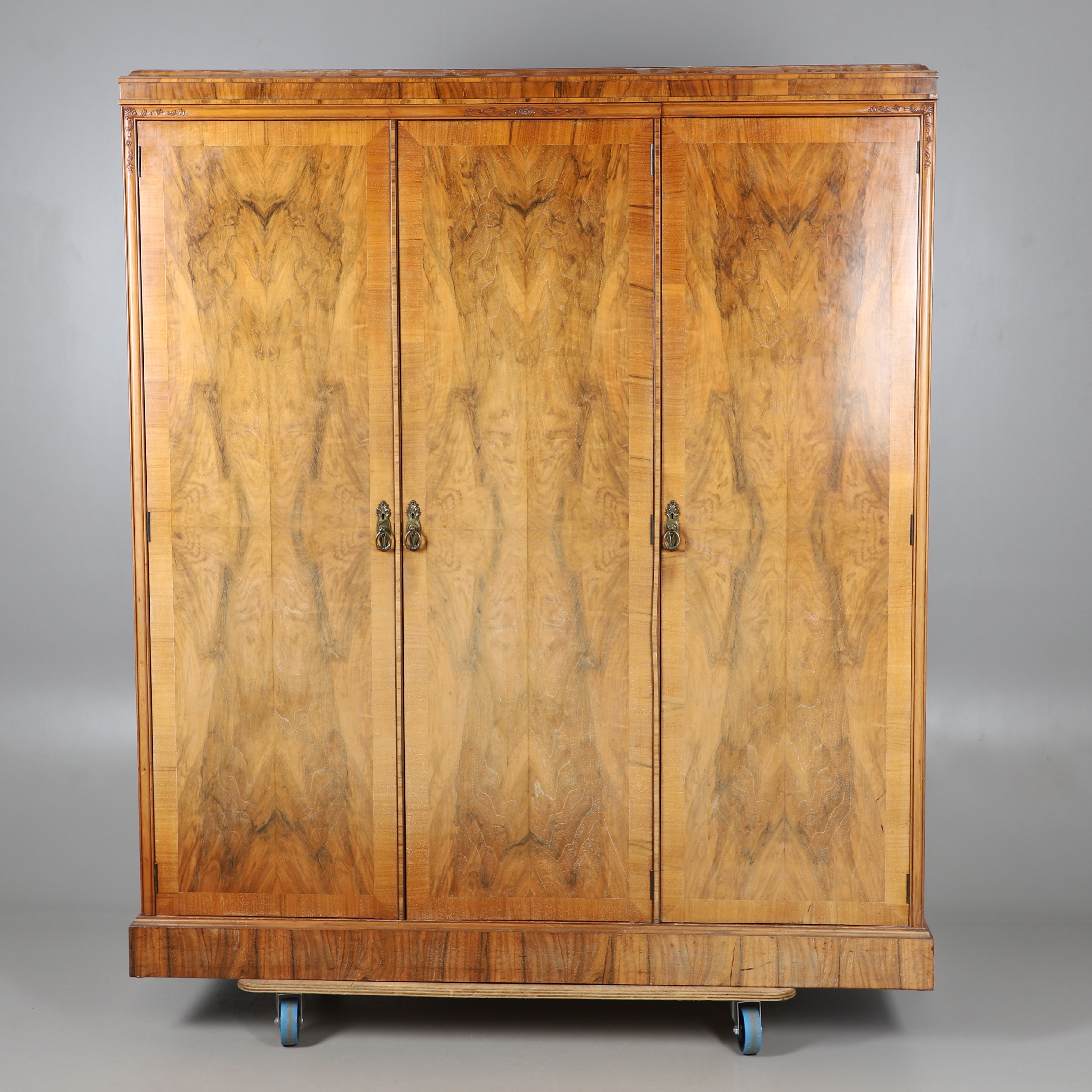 3709715. EIN DREITÜRIGER KOMPAKTER KLEIDERSCHRANK AUS GESCHNITZTEM NUSSBAUM.
