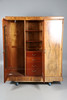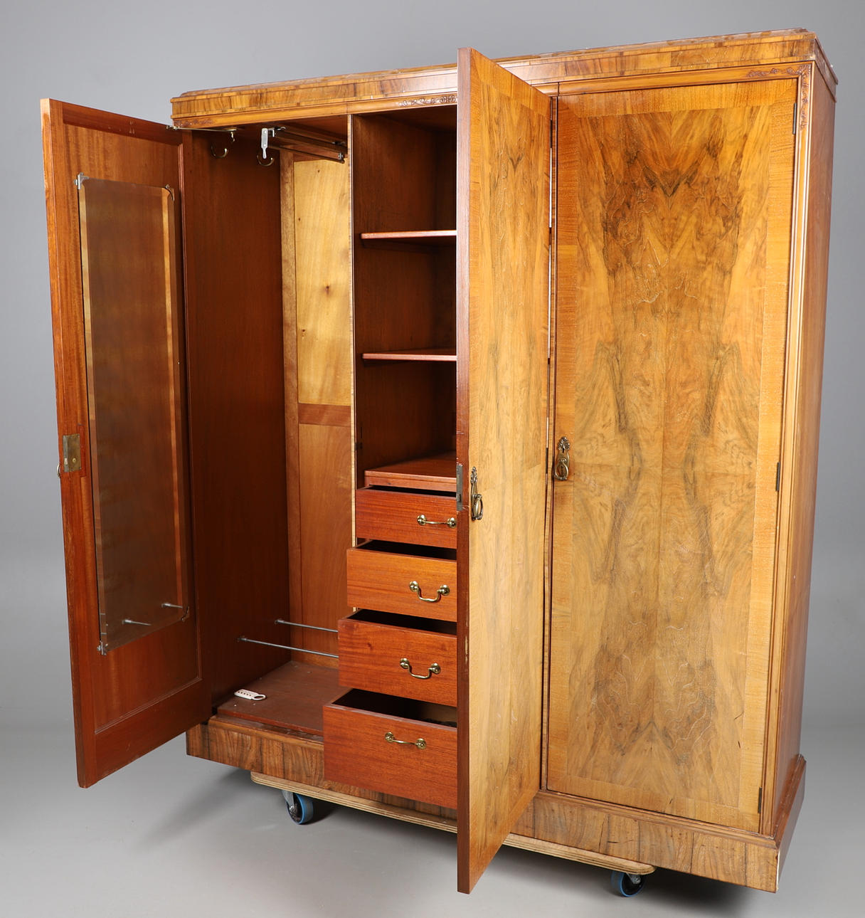 Anfang bis Mitte des 20. Jahrhunderts öffnen sich die viertelfurnierten Türen und lassen drei Fächer zum Vorschein kommen, die zum Aufhängen, Regale, Schublade, Kofferablage usw. geeignet sind.