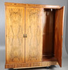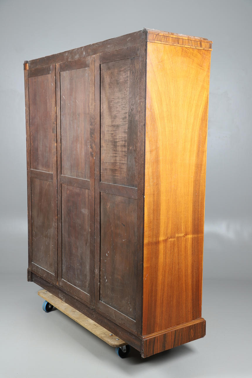 3709715. EIN DREITÜRIGER KOMPAKTER KLEIDERSCHRANK AUS GESCHNITZTEM NUSSBAUM.