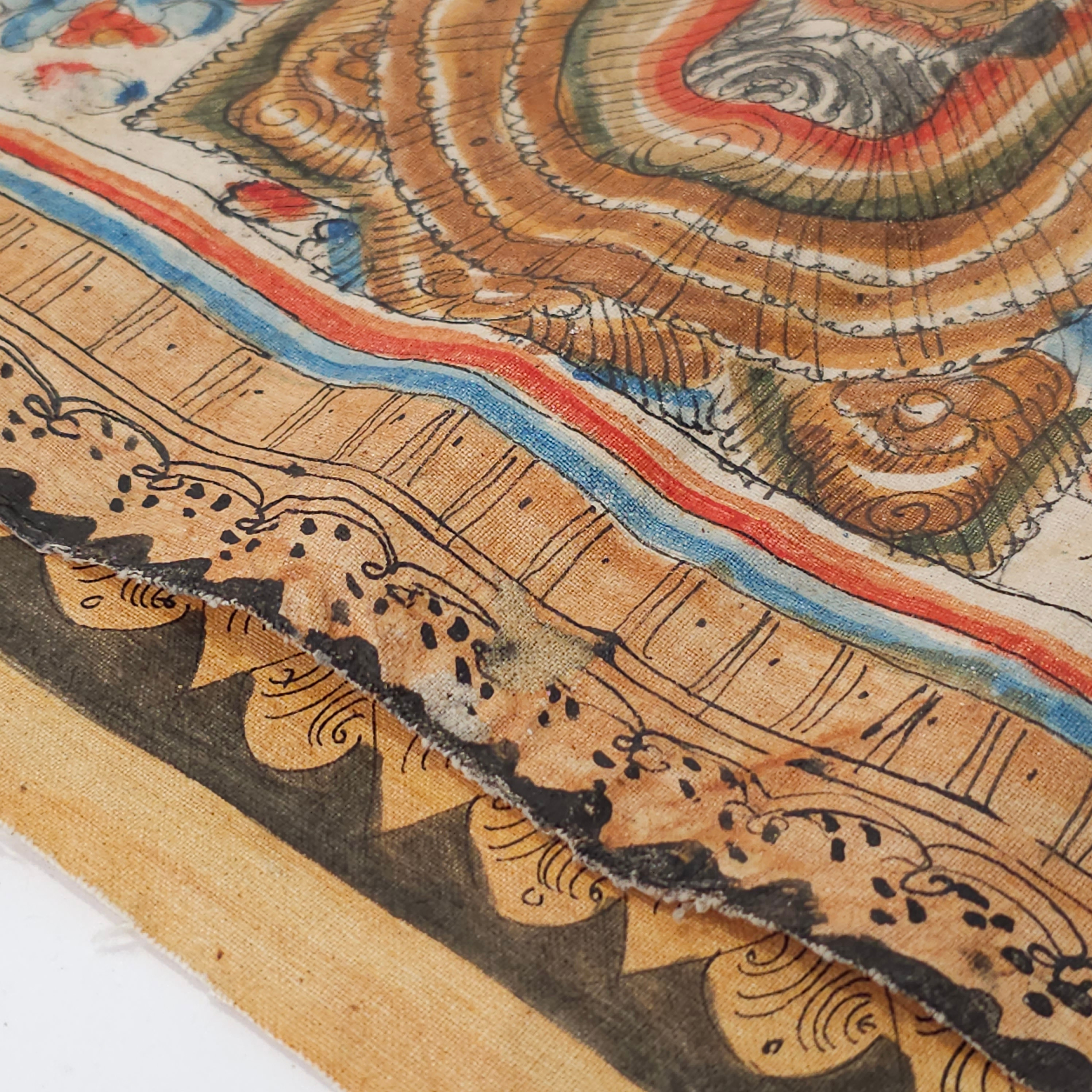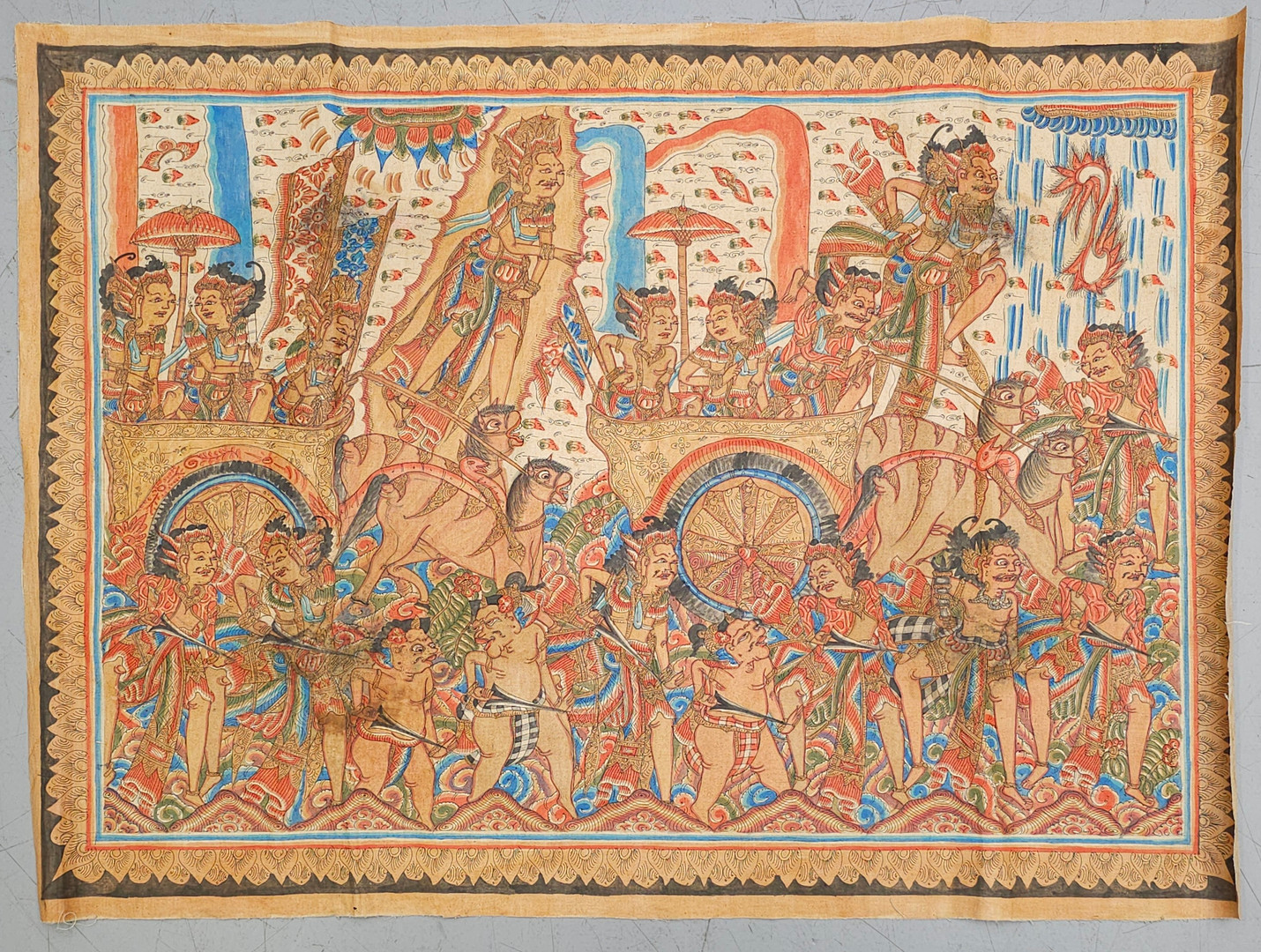 3714630. 2 IN JAVA ODER BALI BEMALTE STOFFE MIT ORIENTALISCHEN SCHRIFTZEICHEN.