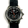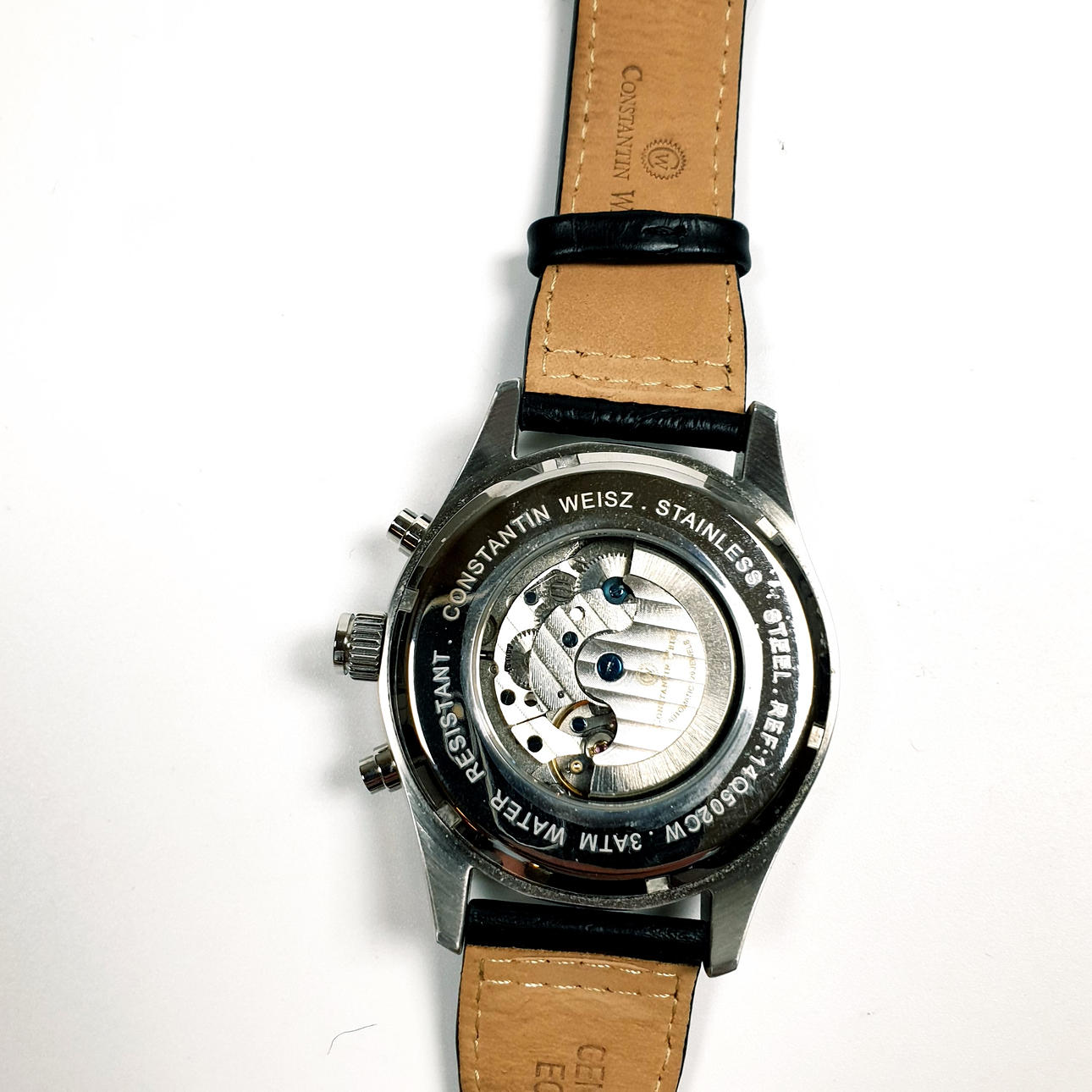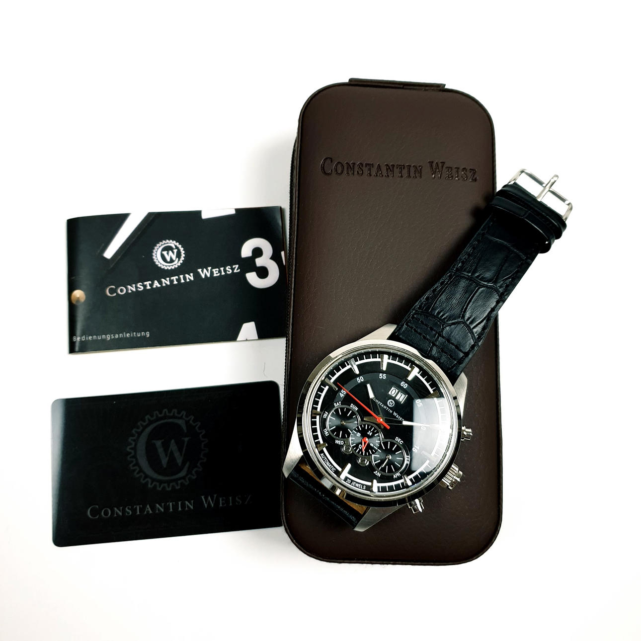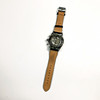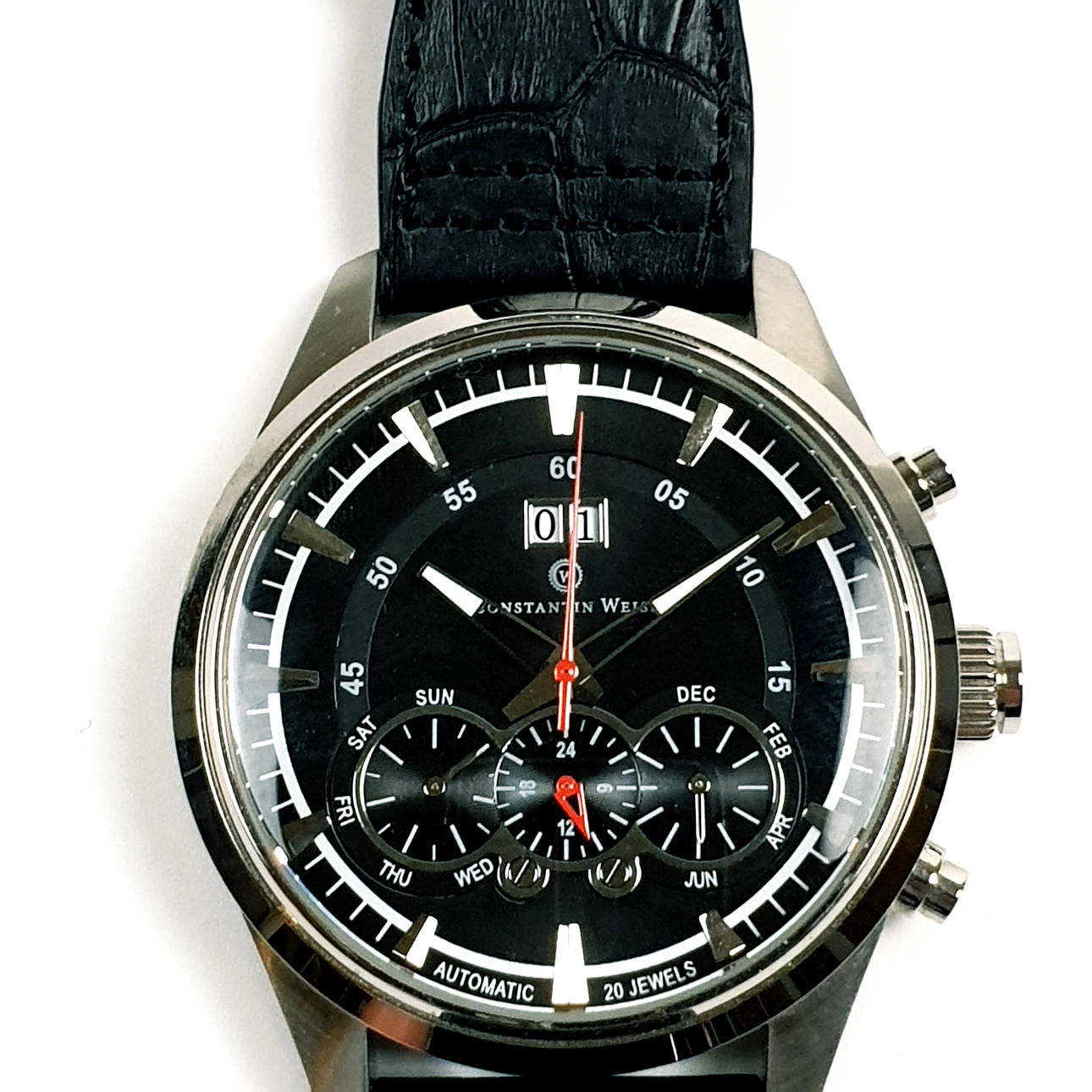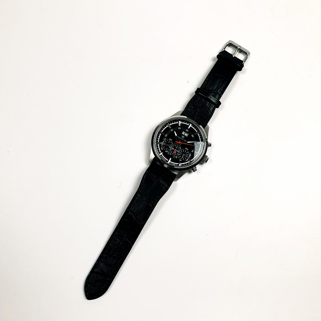 Referenz-Nr. 14Q502CW, 3ATM Water Resistent, beidseitig verglastes Stahlgehäuse, schwarzes Zifferblatt mit schlichtem Strichindex und Zeigern, zentrale Sekunde, Datumanzeige bei 12 Uhr, Wochentag und Monat sowie Stoppuhr im unterem Bereich, an schwarzem Lederarmband