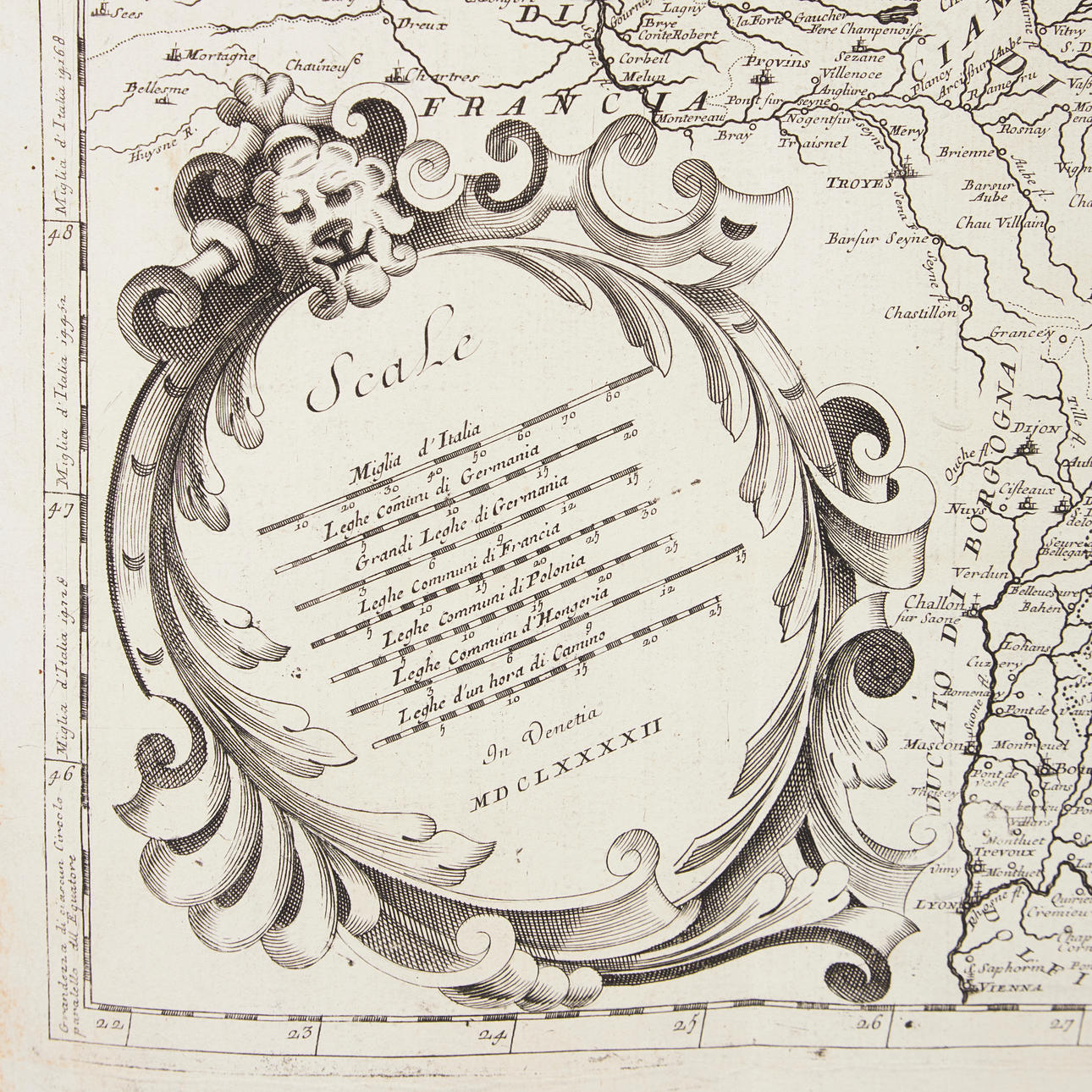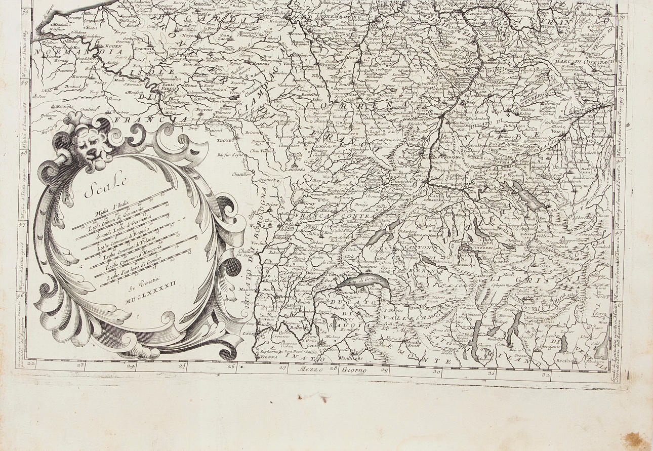 Rückseite mit einem Teil der Karte von Frankreich, der Schweiz usw.