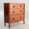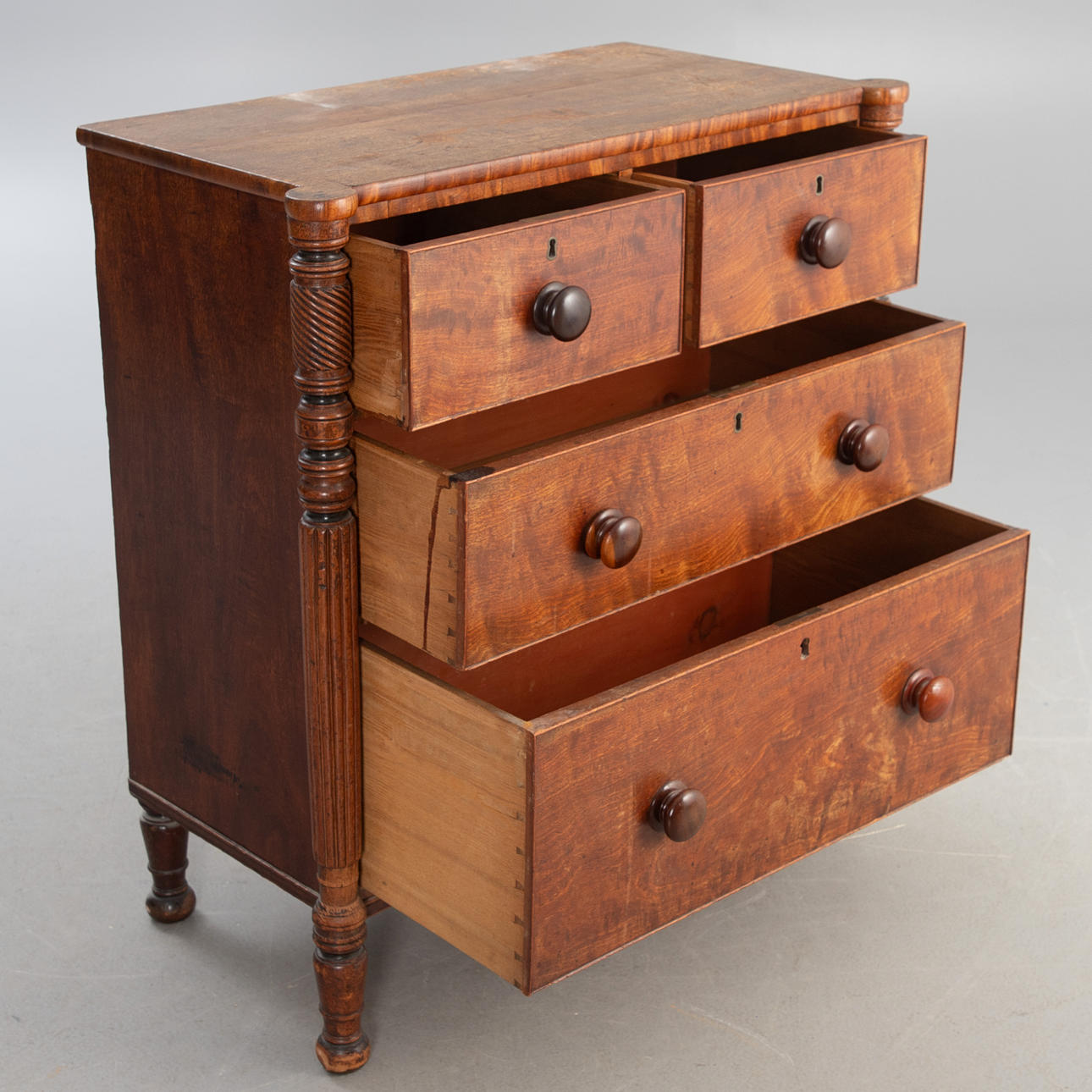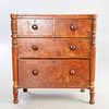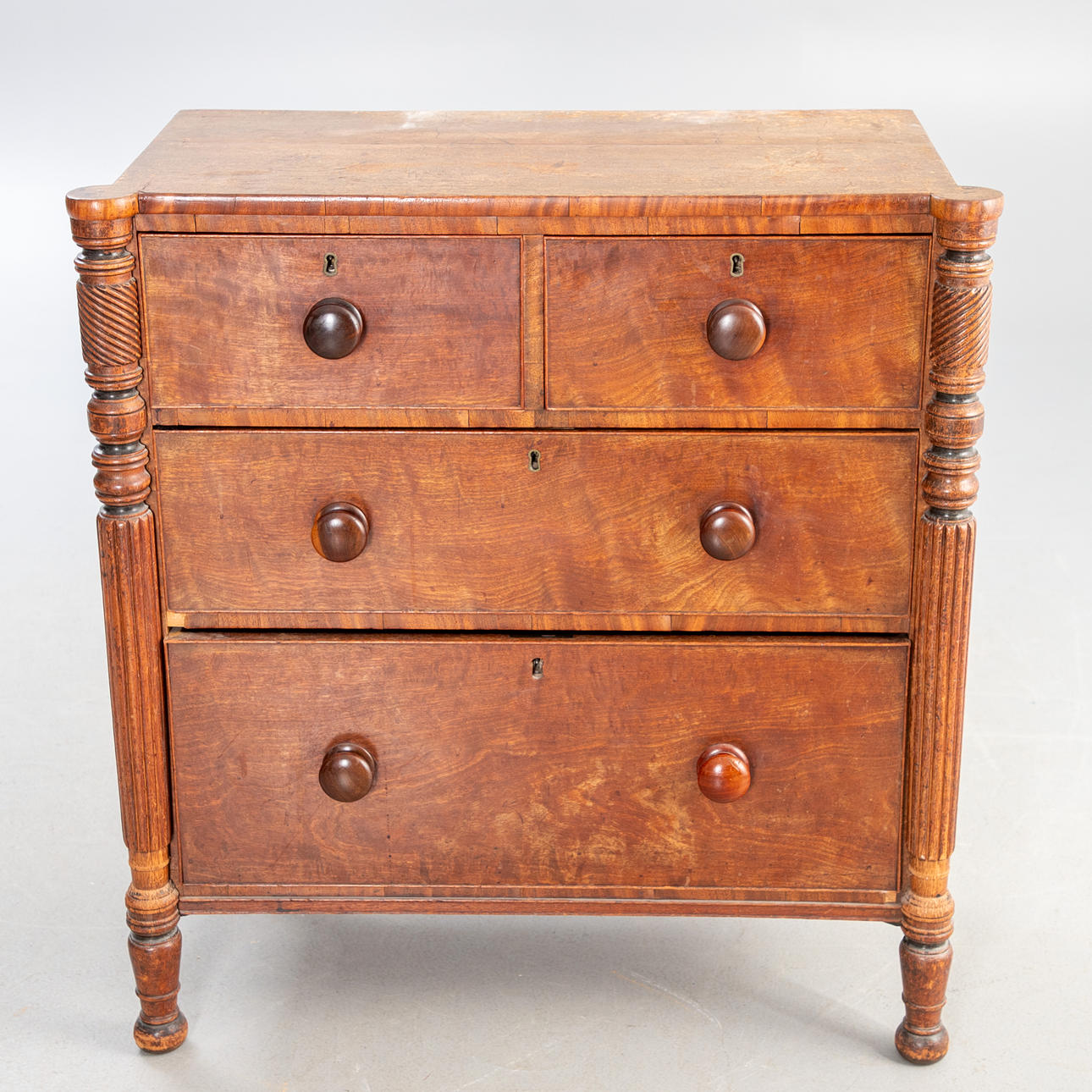 Mahagoni auf Nudelholz furniert. Rechteckiger Korpus mit vier Schubladen in variierenden Größen, flankiert von vorgesetzten, gedrehten Säulen.