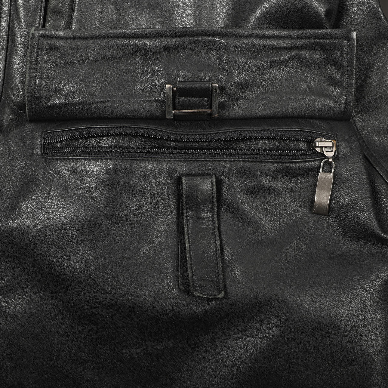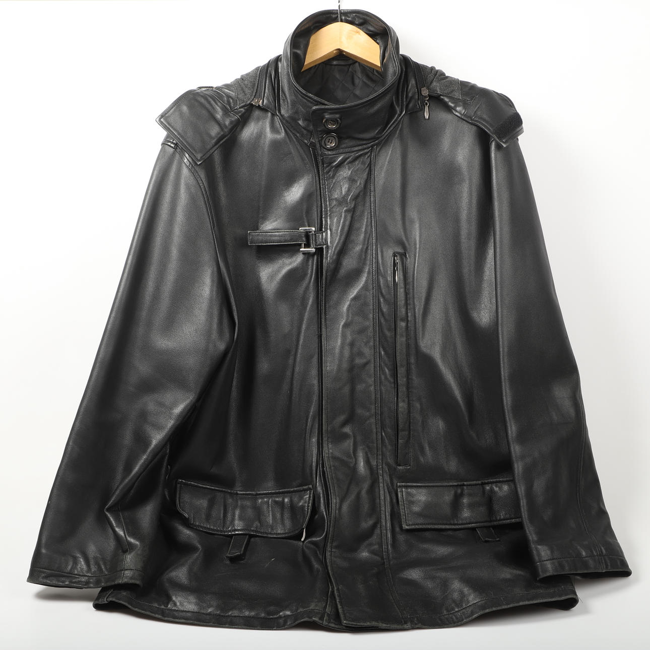 Schwarze Lederjacke, verdeckter Reißverschluss und Knöpfe, 1 Slip mit Klettverschluss