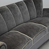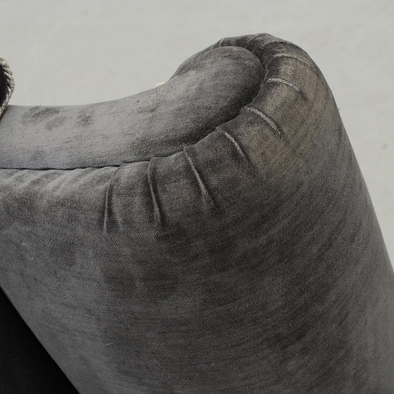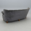 Drehbares Modell. Solide Polsterung mit blaugrauer Plüschpolsterung. Sitzhöhe ca. 43, Rückenhöhe ca. 80, Länge 185, Tiefe ca. 90 cm.