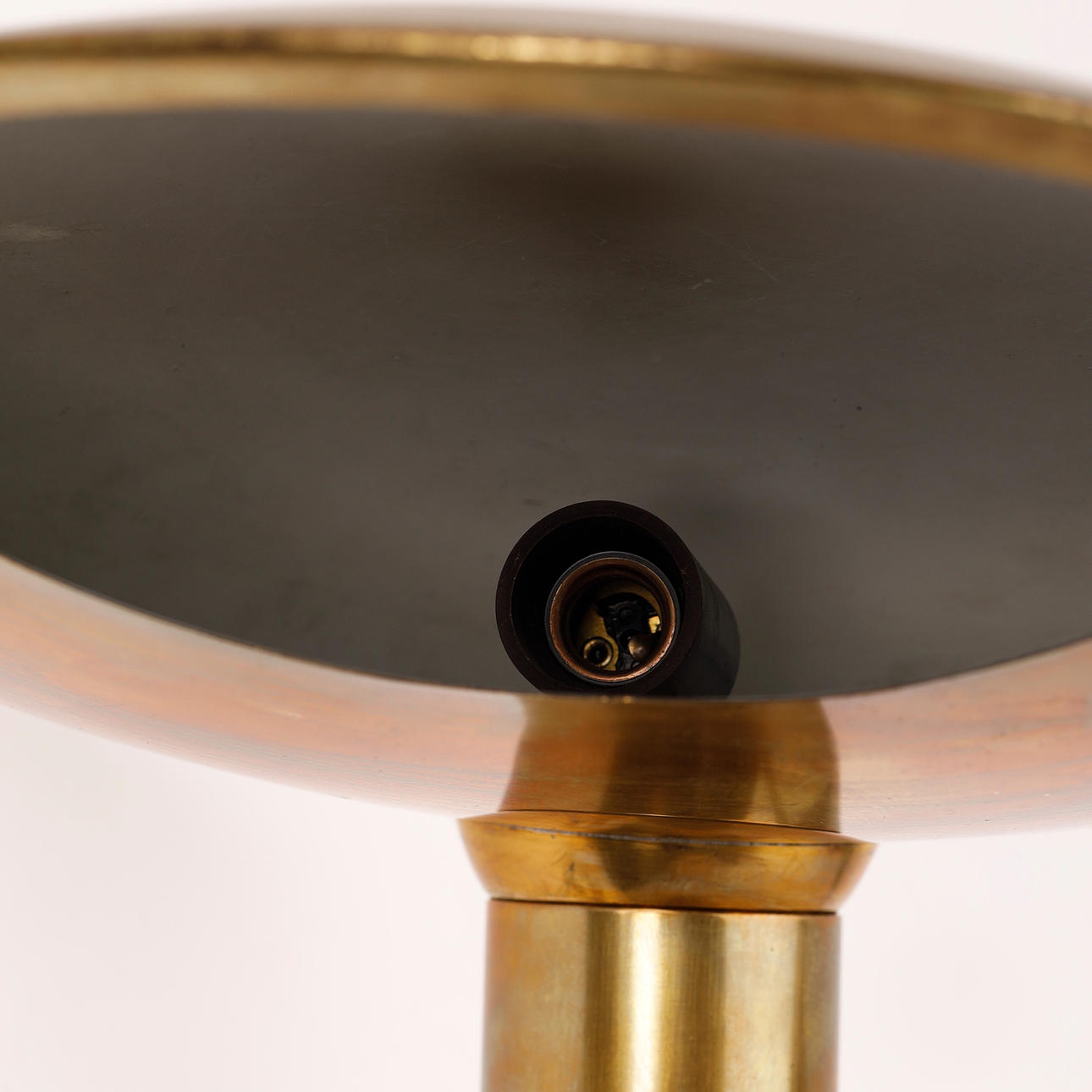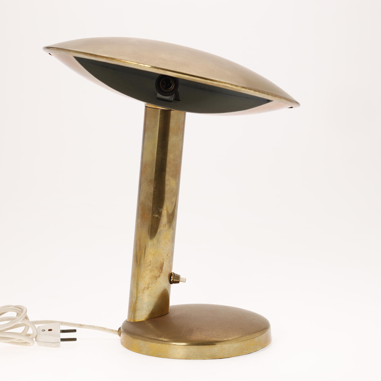 Tischlampe aus Messing, vermutlich skandinavisches Design. Schaltergehäuse am Schaft aus Messing und Kunststoff.