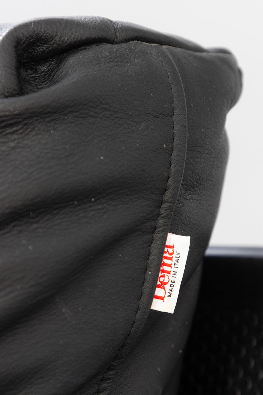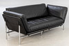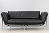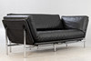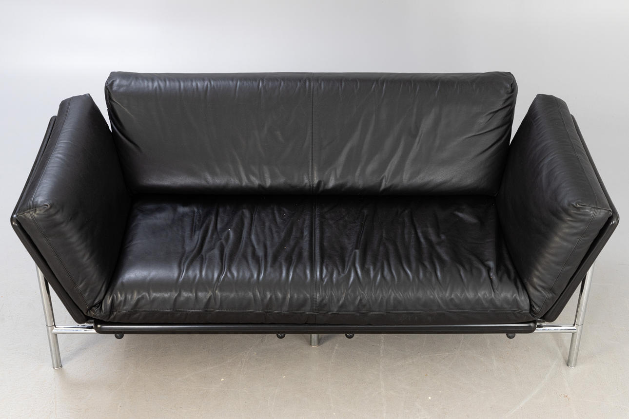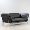 Schwarzes 2-Sitzer Ledersofa 'Modell Rataplan', Roberto Tapinassi für Dema. Gestell aus verchromtem Stahl und Kunststoff. Lederpolster abnehmbar und Armlehnen beidseitig abklappbar.
