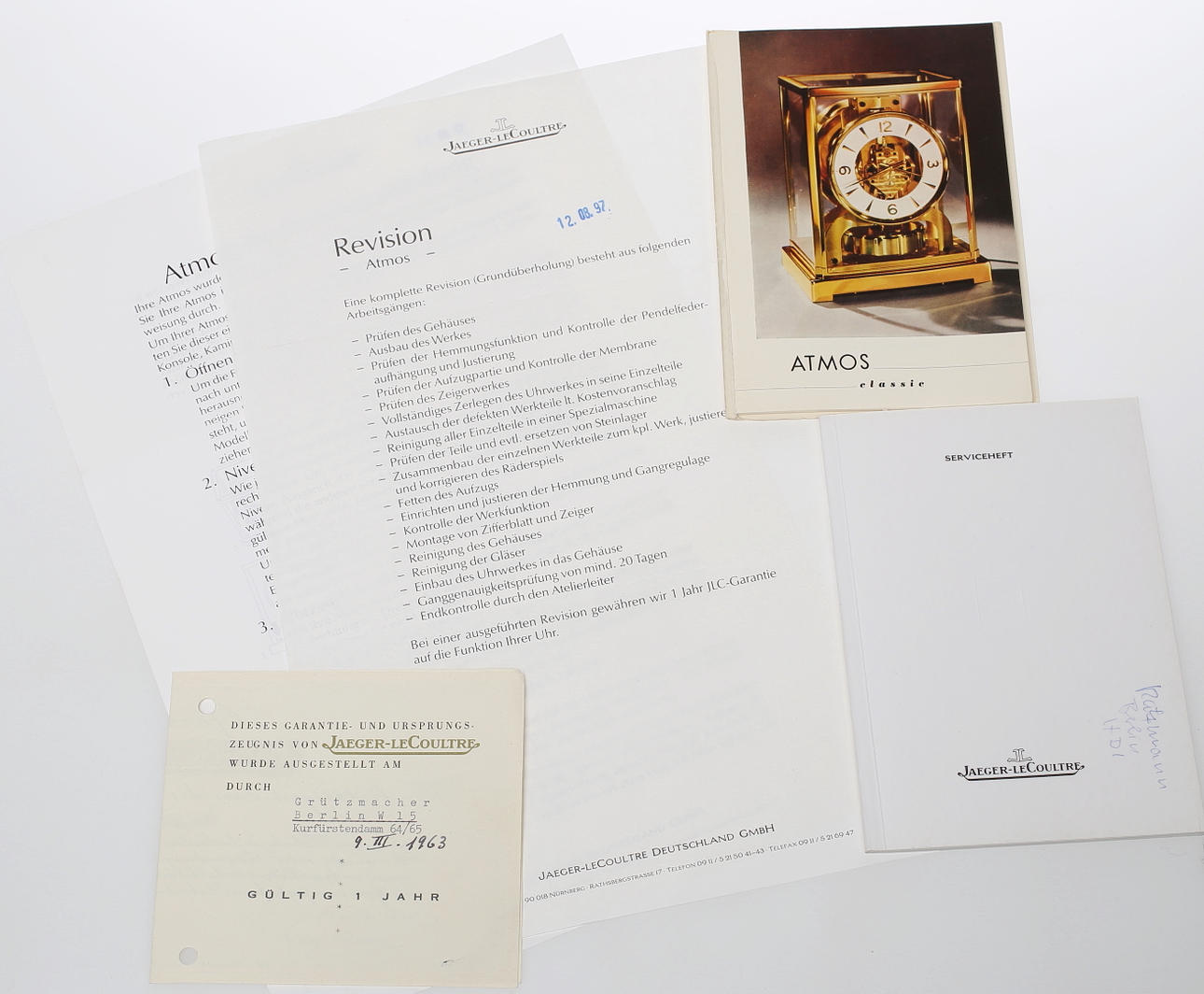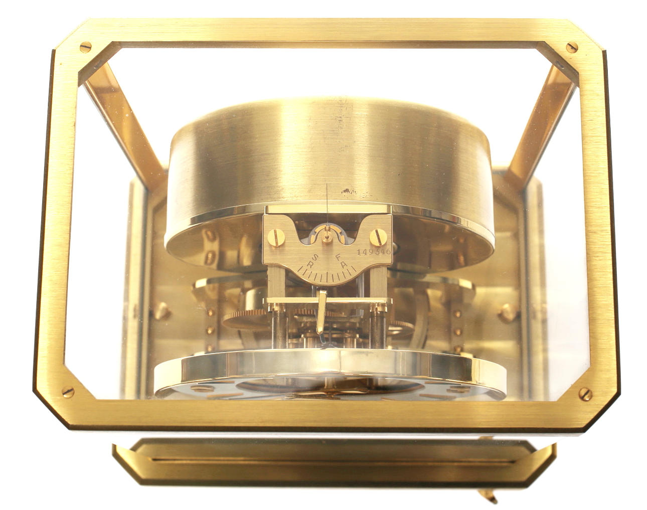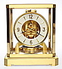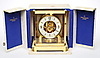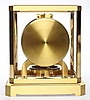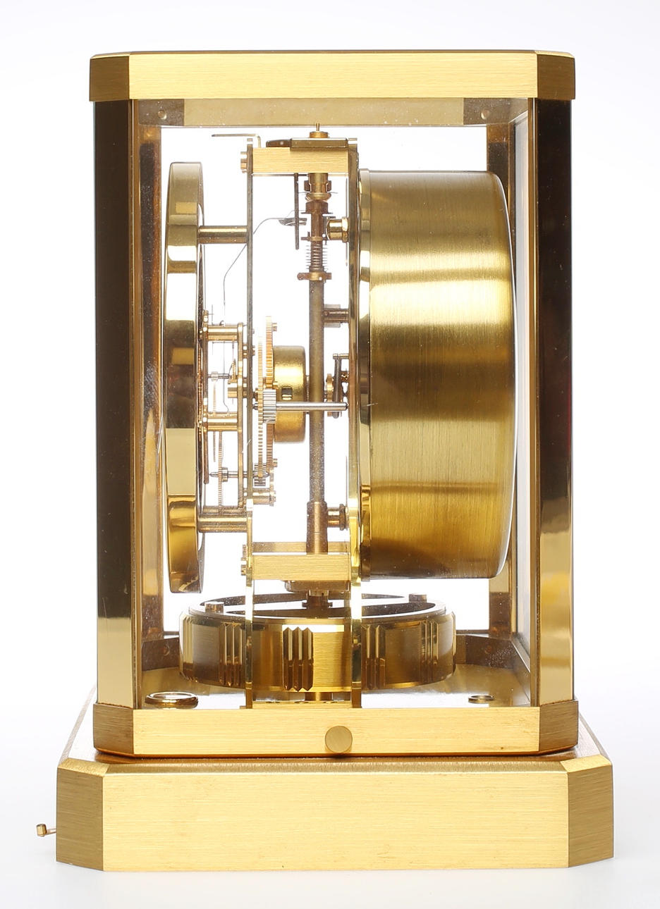 Rechteckiges, fünfseitig verglastes, vergoldetes Messinggehäuse. Zifferblatt aus weißem Emailkranz mit schwarzen, römischen Ziffern in vergoldetem Rahmen, Vergoldetes Werk mit Rotationspendel, Aufzug durch Temperatur- und atmosphärische Druckunterschiede über rückwärtige Trommel und Kette mit Übertragung ans Federhaus. Beigegeben: Bedienungsanleitung, Garantieschein (laut diesem erworben am 09.03.1963) mit Echtheitsbestätigung, Revisionsbericht vom 12.08.1997, originale Verpackung und Wandkonsole aus vergoldetem Messing mit zur Uhr passenden Aussparungen.