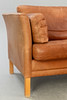 Holzrahmen gepolstert und mit hellbraunem Leder bezogen. Lose Sitz-,Rücken-, und Armlehnenkissen. Beine aus Buche.