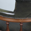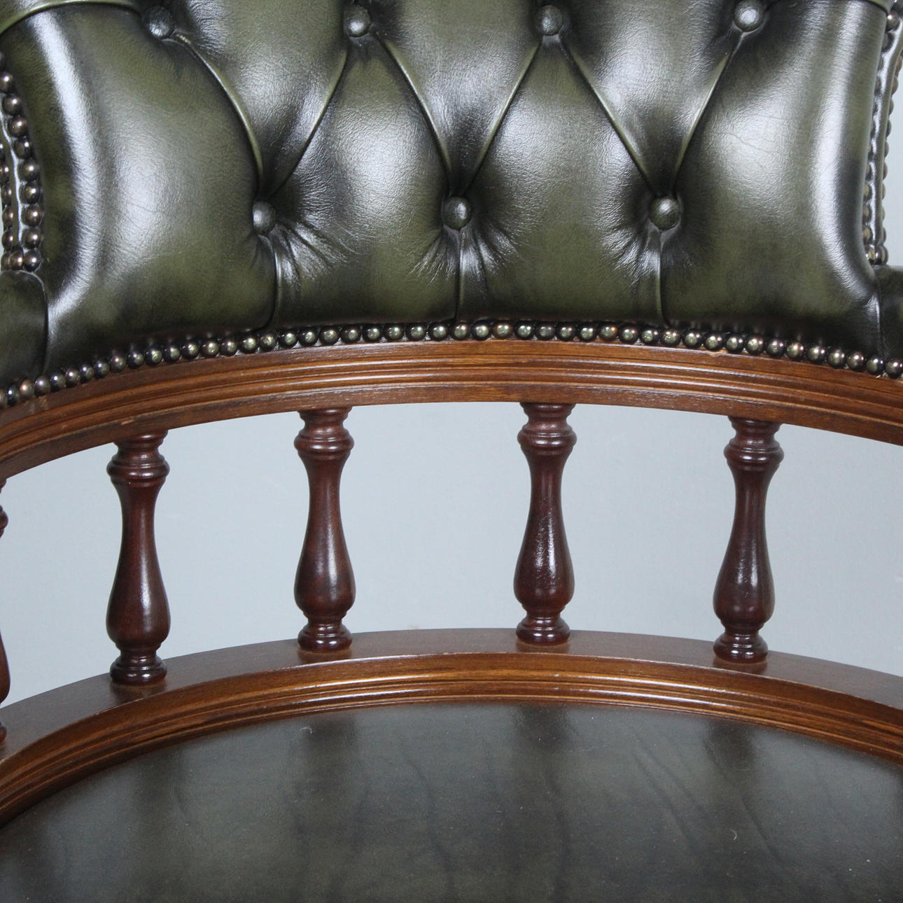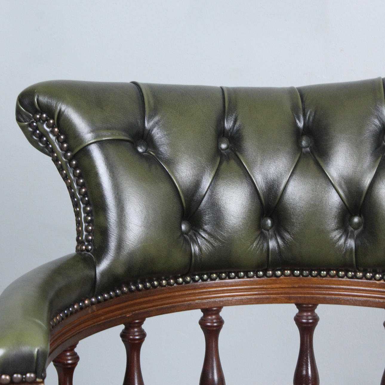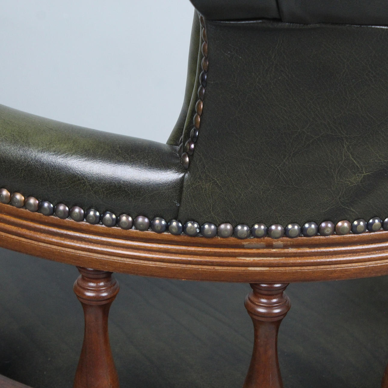 Chesterfield Sessel / Armlehnsessel / Bürostuhl auf Rollen, aufgepolsterte Konstruktion aus grünem, gestepptem Leder mit Knopfheftung, Armlehnen und Rückenlehne mit Nieten verziert,