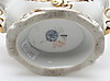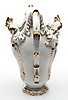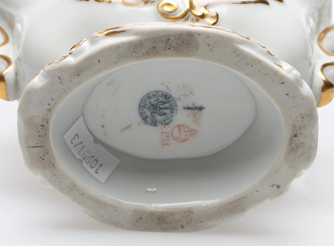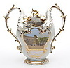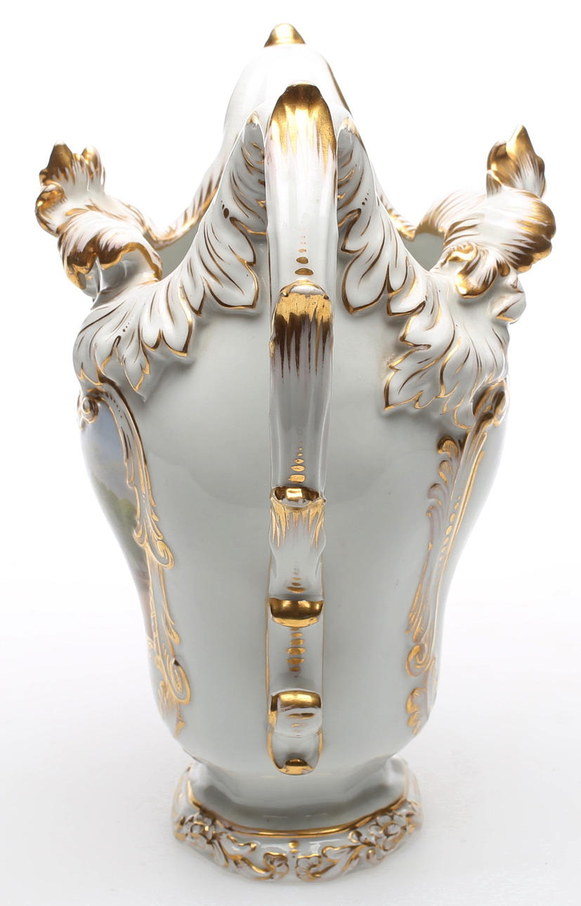 Schauseite der gebauchten Wandung mit bunt gemalter Ansicht des Reiterdenkmals "Friedrichs des Großen" nach C. D. Rauch in Berlin, Unter den Linden, Rückseite mit Blumenmalerei in Gold. Kartusche, Henkel, geschweifte Lippe und Sockel mit Rocaillenrelief und Goldkonturen, Szepter- und Pfennigmarke mit rotem Reichsapfel über KPM, Berlin, 1849-1870. 1. Wahl.
