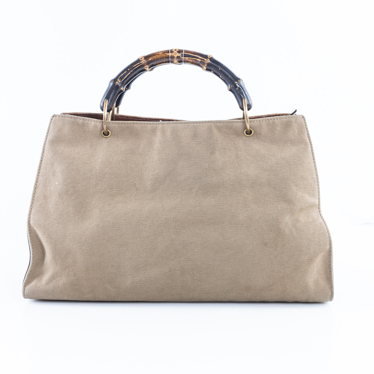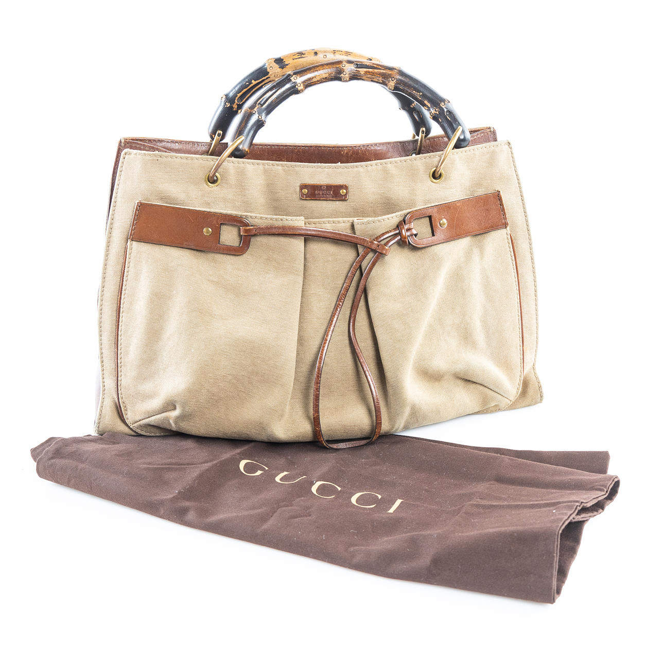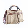 Tasche aus Baumwollleinen und braunem Leder. Griff aus Bambus Innenraum mit Mittelfach mit Reißverschluss. Staubbeutel im Lieferumfang enthalten. Mit GUCCI gekennzeichnet, hergestellt in Italien und 109138 002058. ca. 40 x 24 x 14 cm.