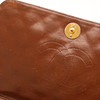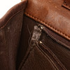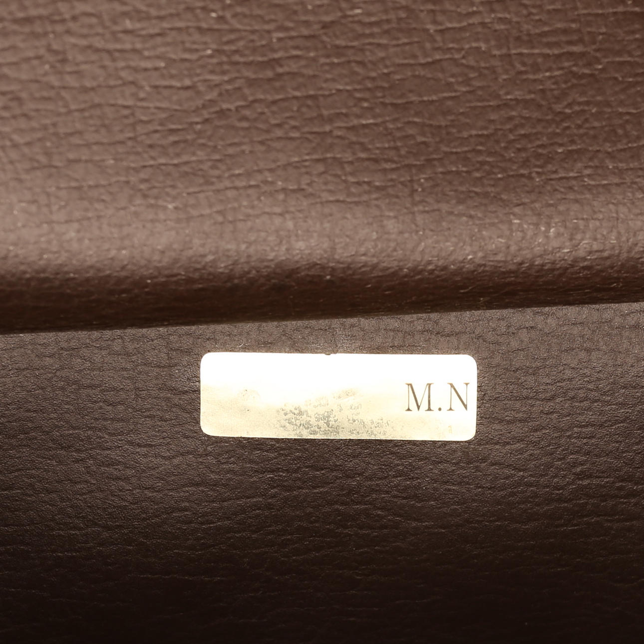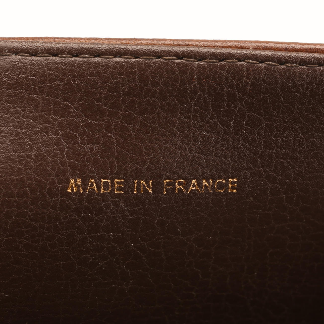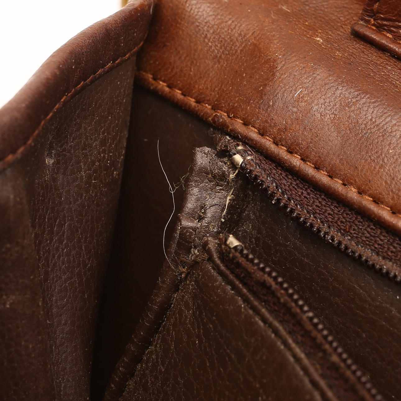 Schokobraunes, gestepptes Leder mit gelben Metalldetails.