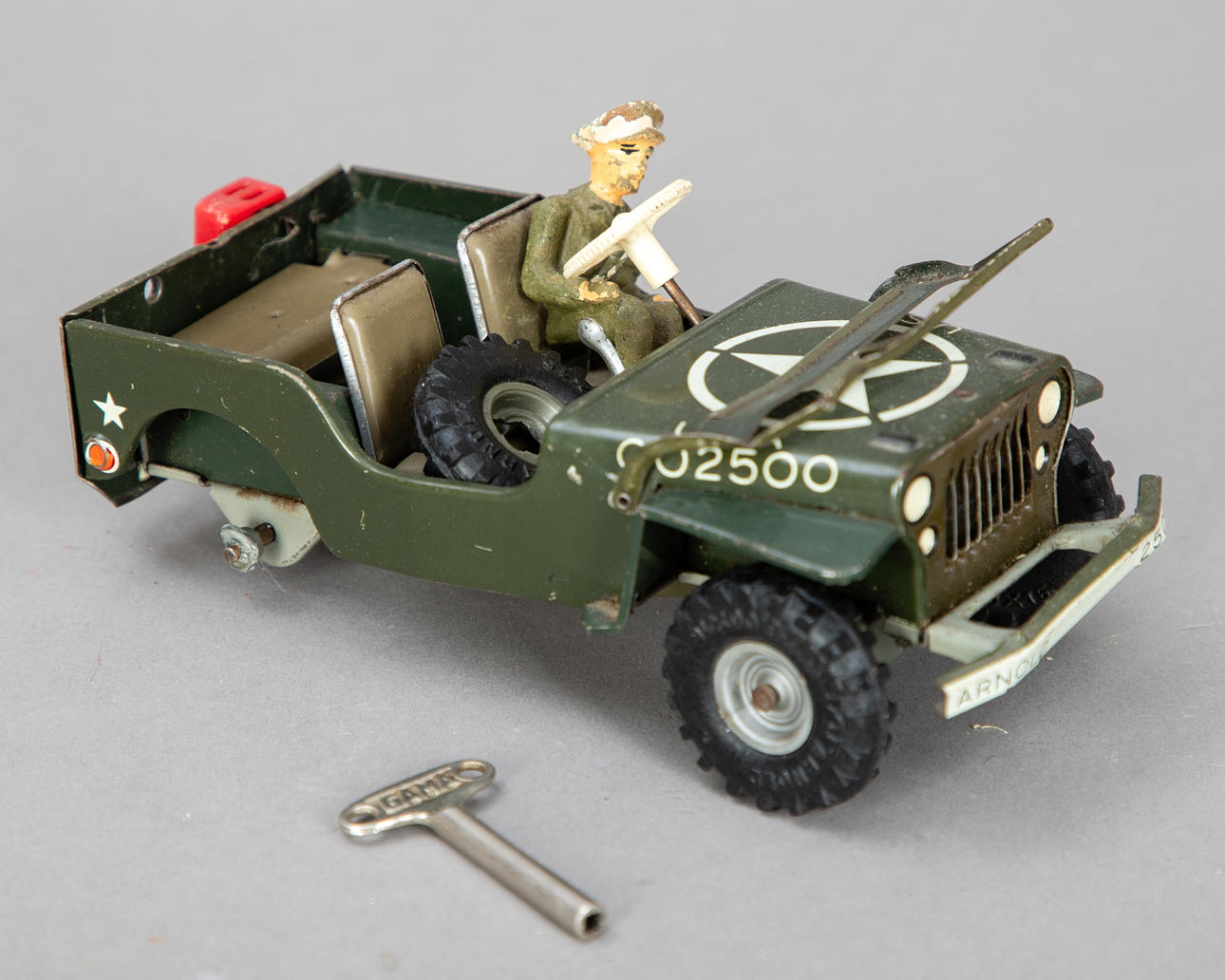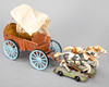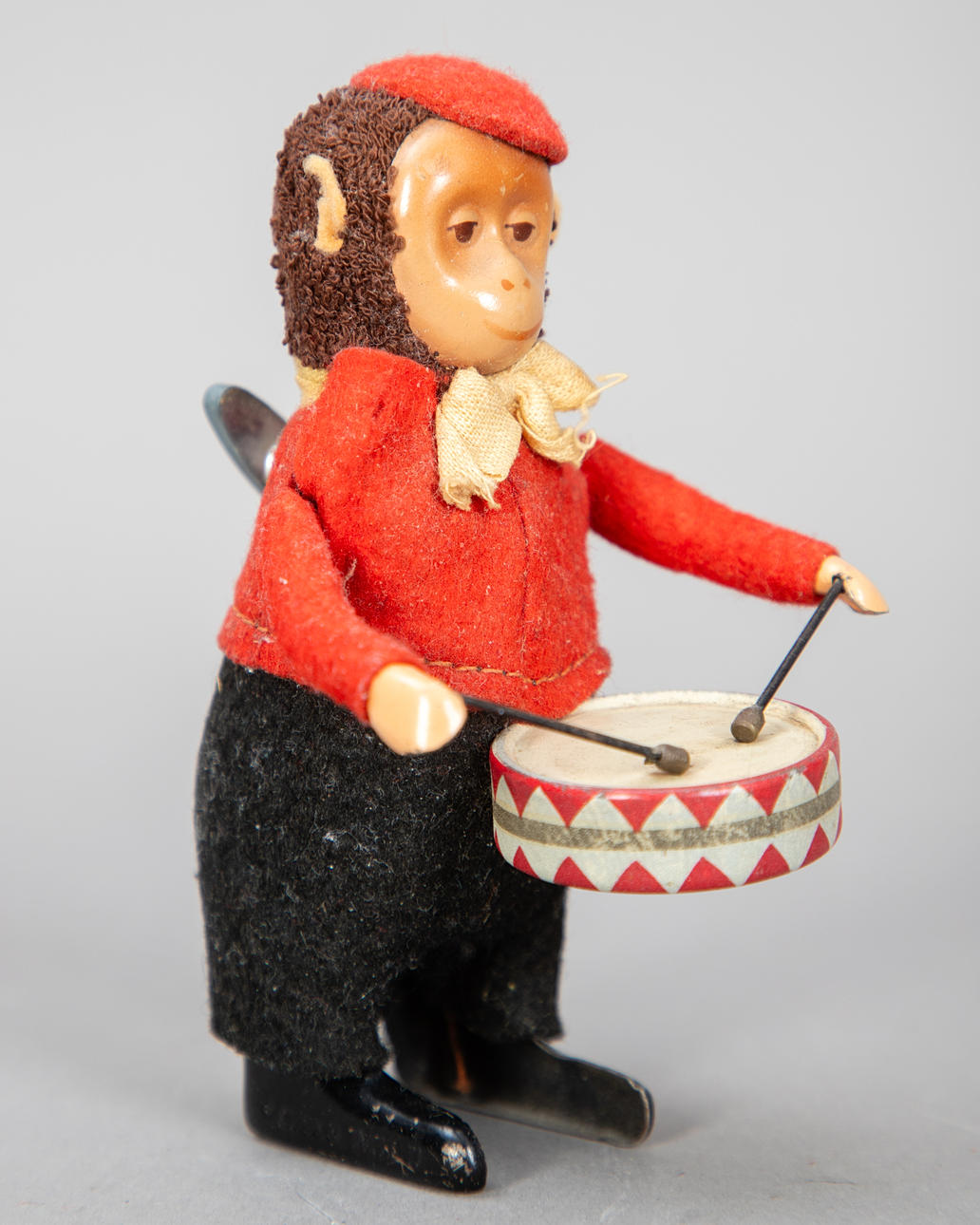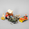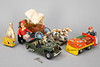 Blech, lithographiert und lackiert. In verschiedenen Ausführungen, u.a. 1 Kofferträger (Gang- und Rollbewegungen funktionieren nicht), 1Affe als Trommler, Schuco (Federaufzug funktioniert nicht), Koffer Kuli, 1 Pferdegespann mit Planwagen und ein Militärfahrzeug der Marke Arnold.