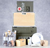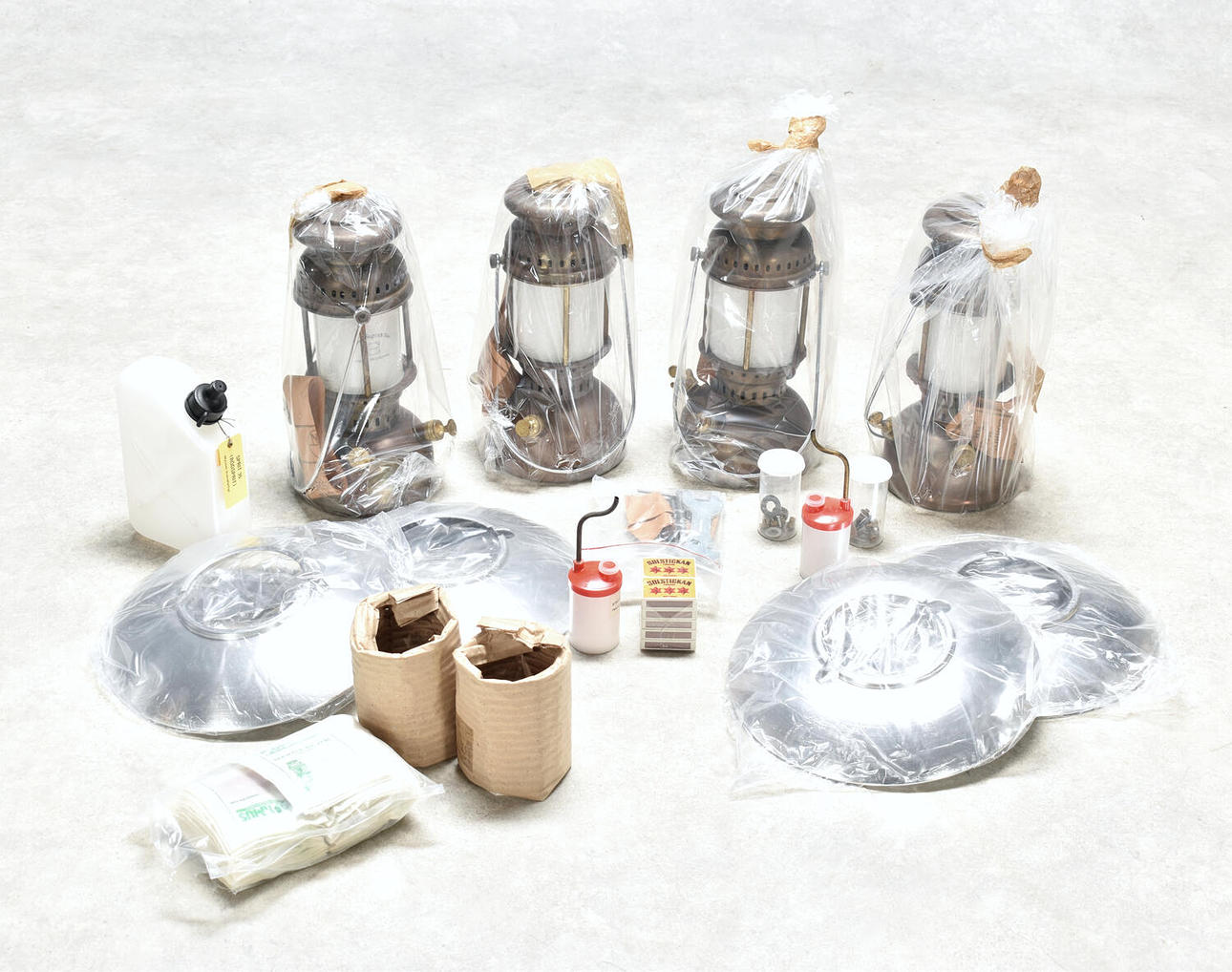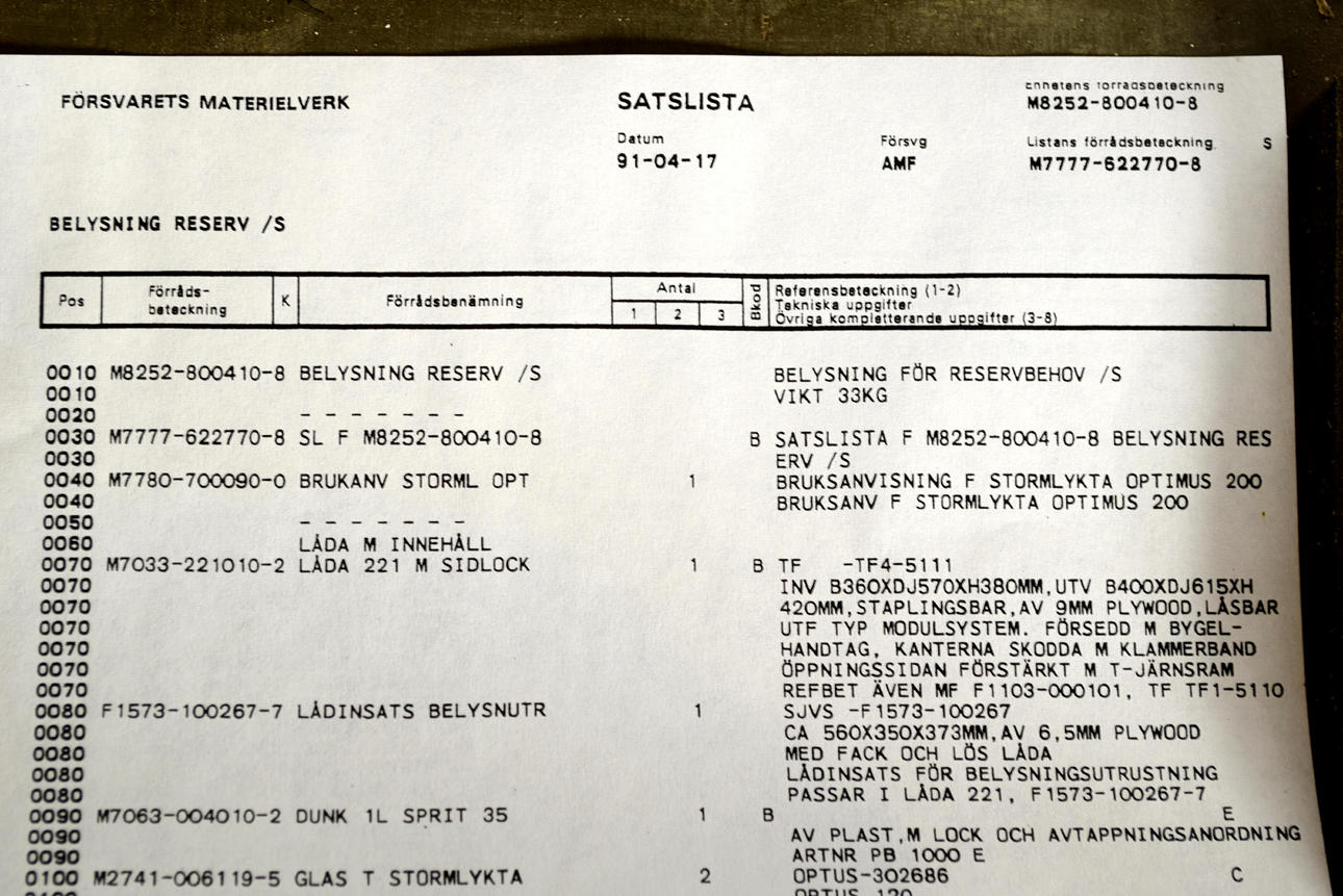 Material des Verteidigungsministeriums. Box mit vier Sturmlaternen Optimus 1200 M/1200G, Ersatzteilen, Streichhölzern, vier Lampenschirmen, Ersatzglas, Gläsern und mehr. Außenmaße: Höhe: 42 cm Länge: 61 cm Breite: 40 cm.