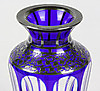 farbloses Kristallglas mundgeblasen, Blau überfangen und von Hand beschliffen, geschnittener Boden und beidseitig angephaster Rand, konischer sich nach unten verjüngender Korpus in 8-facher Symmetrie facettiert beschliffen, taillierter Hals mit nach aussen schwingendem Rand, im Schulterbreich mit Maiglöckchen Silberoverlay sowie im Halsbereich facettiert ausgeführt, H ca. 15 cm, Josephinenhütte um 1920.