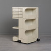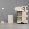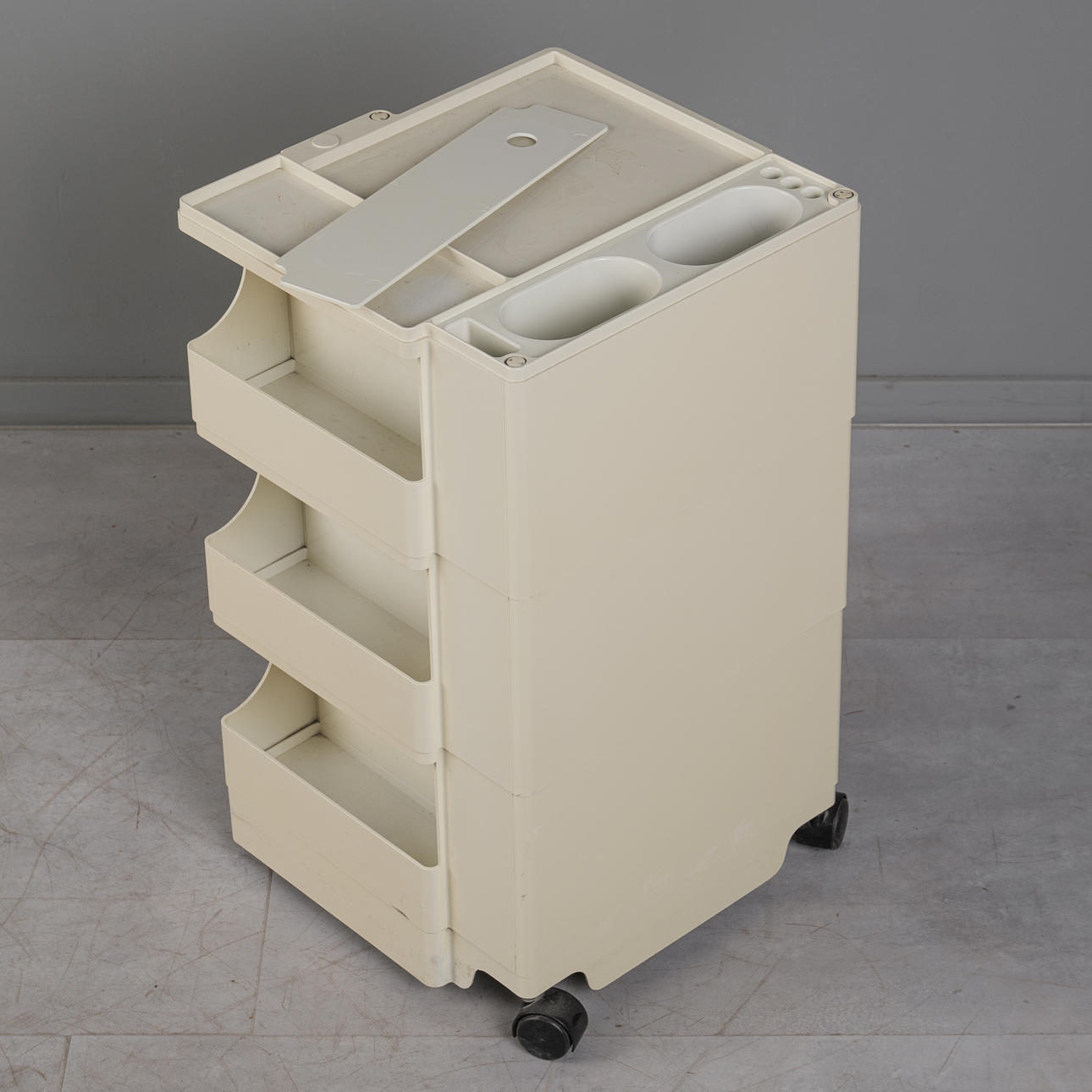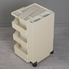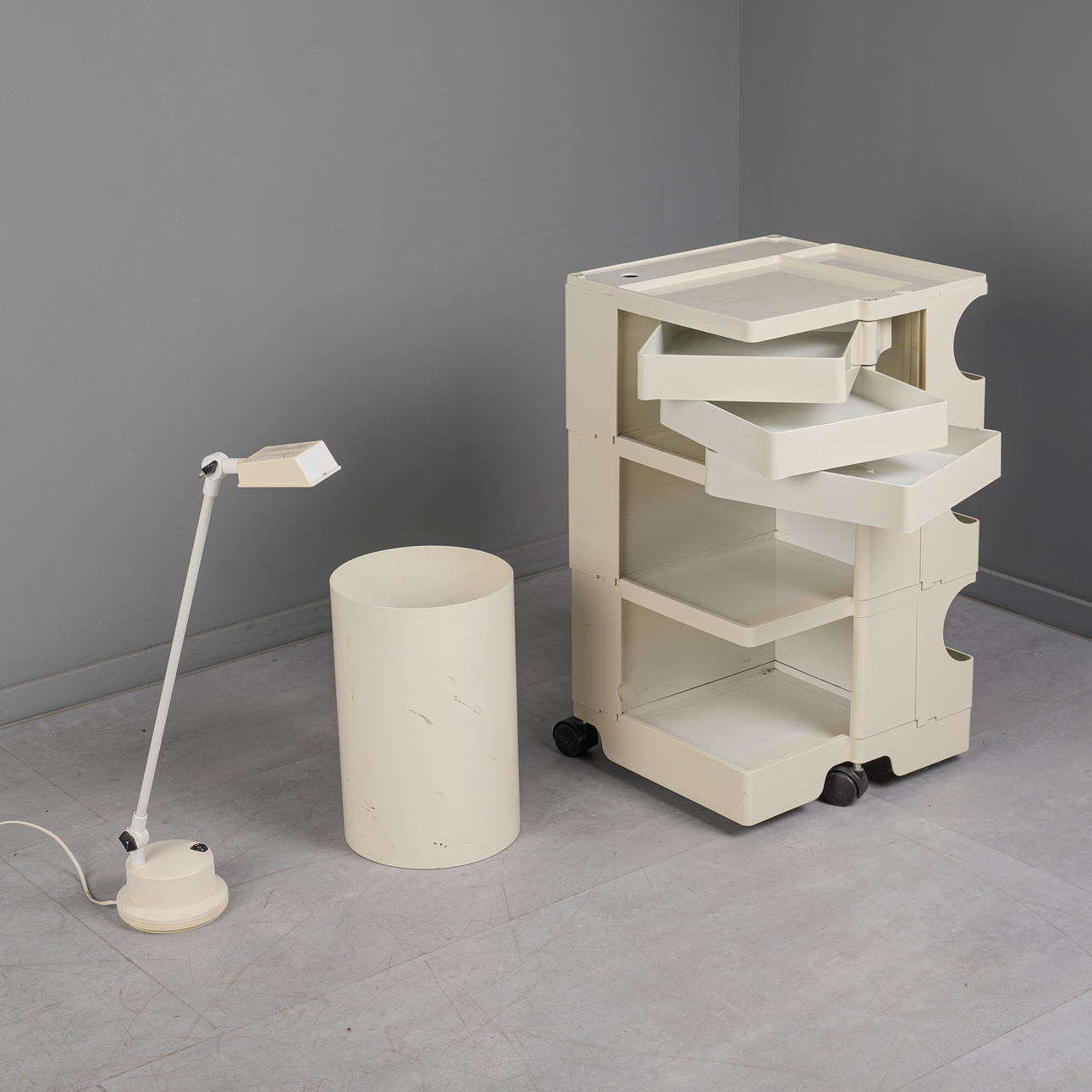 Ensemble bestehend aus einem Rollwagen, einem Mülleimer und einer Tischlampe, jeweils aus weißem Kunststoff, Mülleimer und Rollwagen unterseitig mit Herstellerbezeichnung. (3).