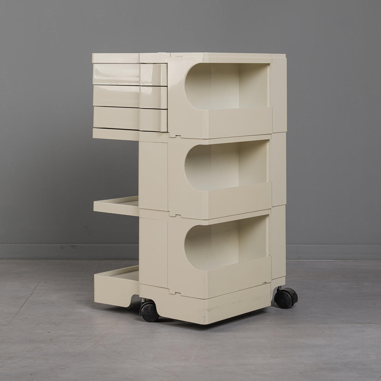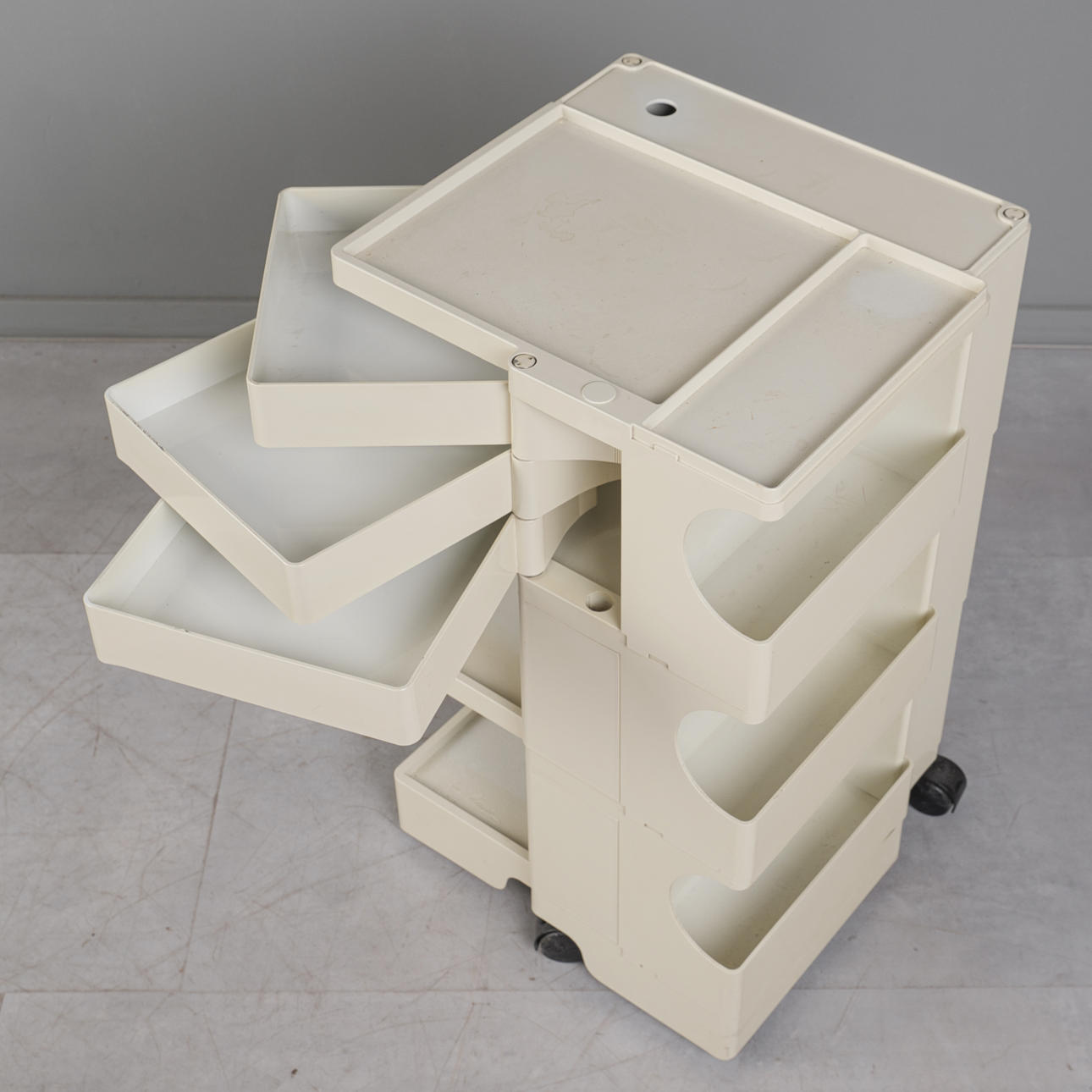 Altersgemäße Gebrauchs- und Reibespuren, Kunststoff stärker vergilbt, Kratzer im Kunststoff. Am Rollcontainer mit kleiner Bruchstelle unten.