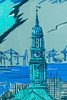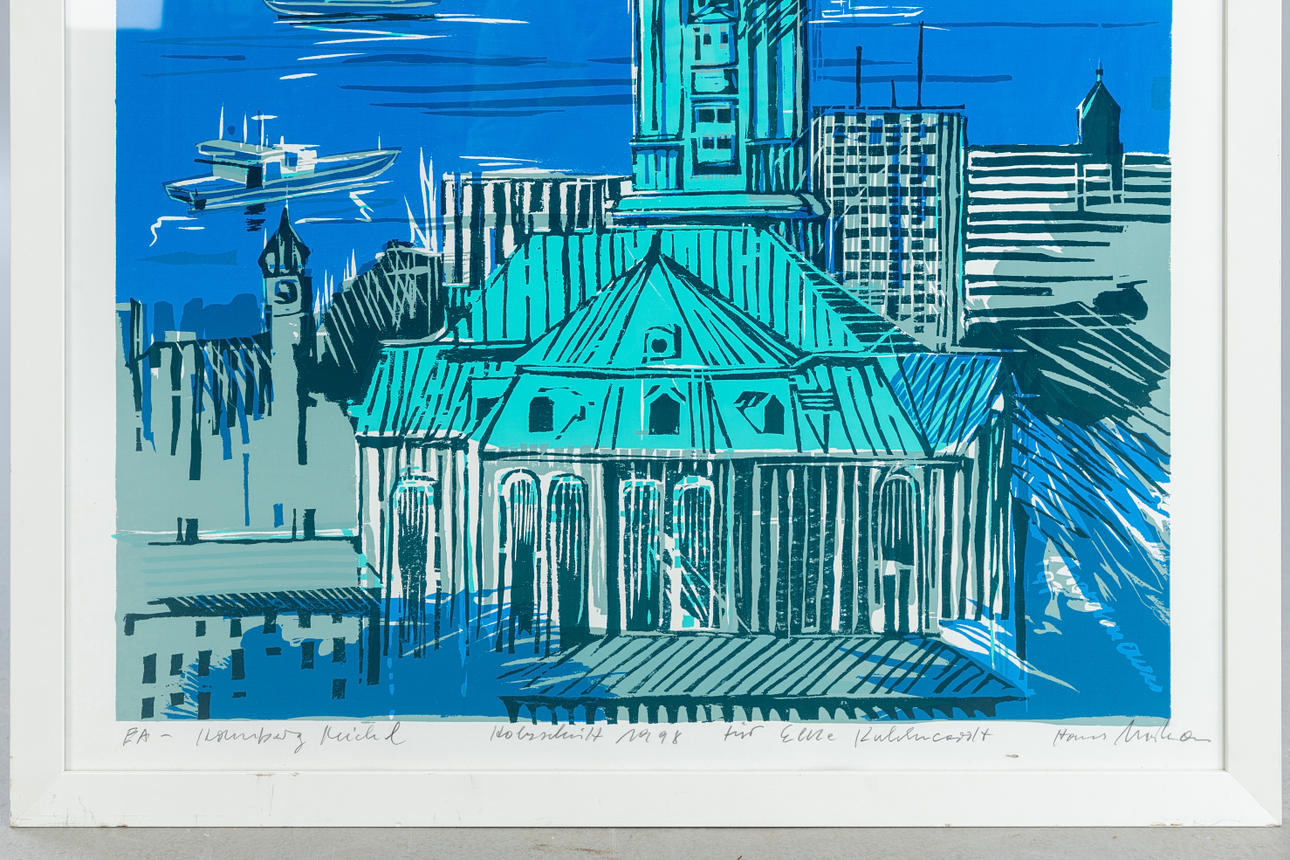 Hans Nordmann (geb. 1940), Hamburg Michel, Farbholzschnitt, 1998, signiert, datiert, betitelt, bezeichnet 'E.A' sowie gewidmet, Exemplar ausserhalb der Auflage, ca. 99 x 69 cm, hinter Glas gerahmt, mit Rahmen ca. 112 x 84 cm.