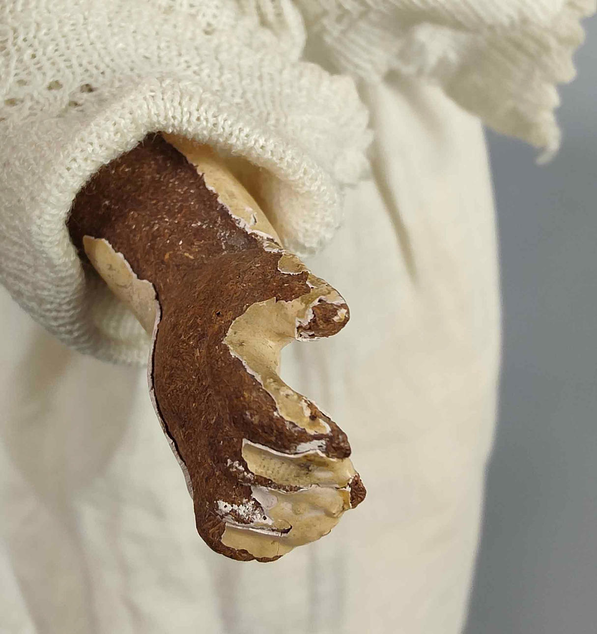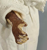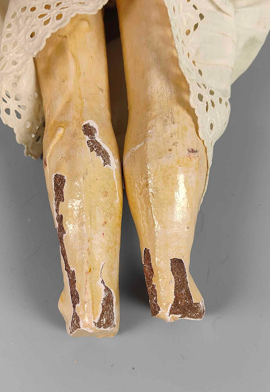 Bisquitporzellan Kurbelkopf gemarkt *3/0*, fein modelliertes und bemaltes Geischtchen mit braunen Schlafaugen, offenem Mund mit ibenliegenden Zähnchen und Kinngrübchen, dunkelblondes Echthaar, der Massekörper und die beweglichen Arme sowie Beine sind dessolat, L ca. 42 cm, die geliebte und bespielt Puppe trägt eine langes Spitzenkleid und Jäckchen sowie einen Strohhut.