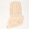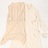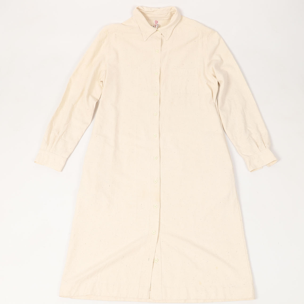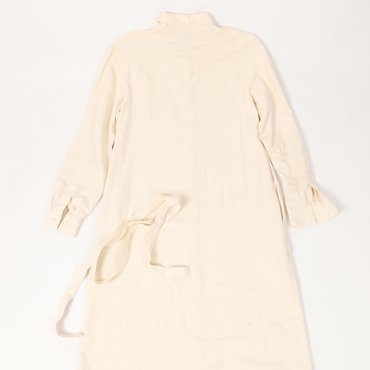 Kleid mit Gürtel in der Taille, eierschalenfarbene Baumwolle mit Schalenresten, Länge 105, Ärmelinnenmaße 45 cm