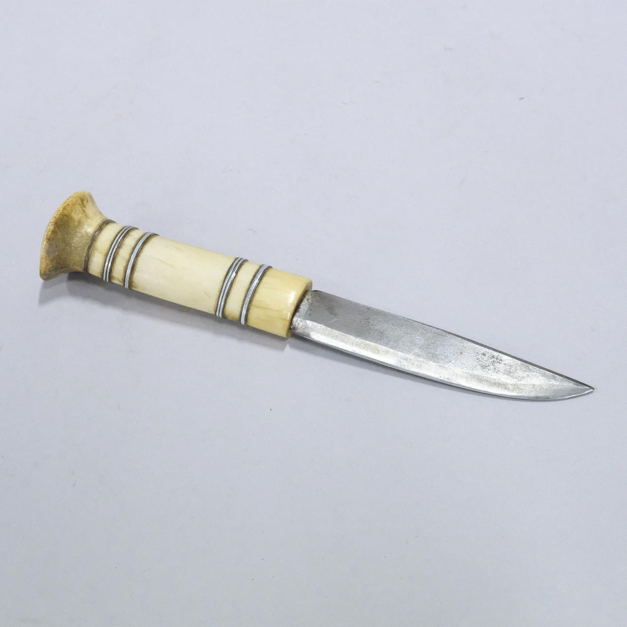 Griff aus Rentierhorn mit Einlagen aus 18 Karat Weißgold, Scheide aus Rentierhorn mit geschnitztem Dekor, das Landschaften mit Rentieren und Horn darstellt, Leder, erste Hälfte des 20. Jahrhunderts, Länge 23 cm.