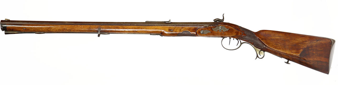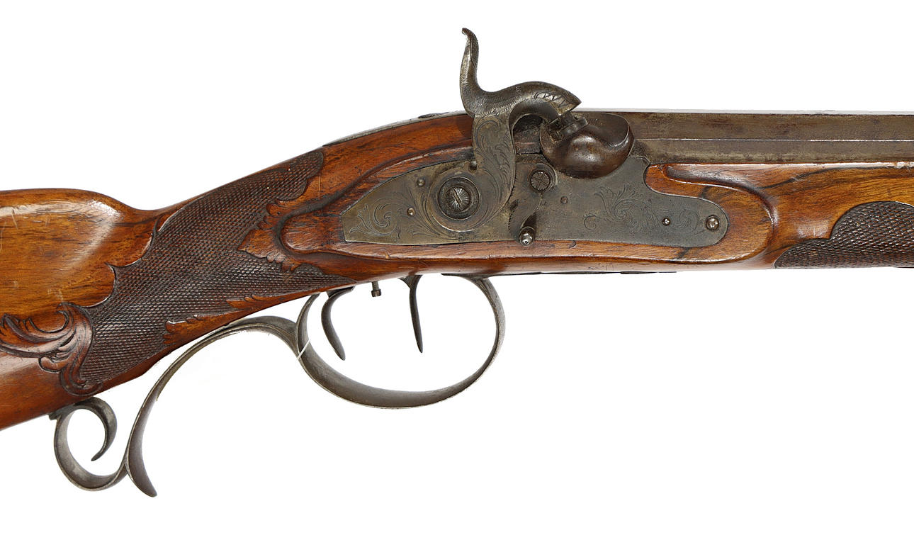 Achteckiger geriffelter Lauf ca. 74 cm, Kaliber ca. 15 mm, verstellbares Visier, Holzkolben mit Hornnase und Wangenstütze, Kolbenkasten, graviertes Schloss, Kunstdruck, Stahlbeschläge und Stahlkappe.