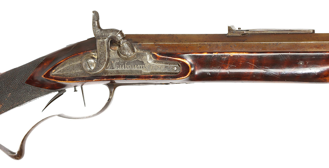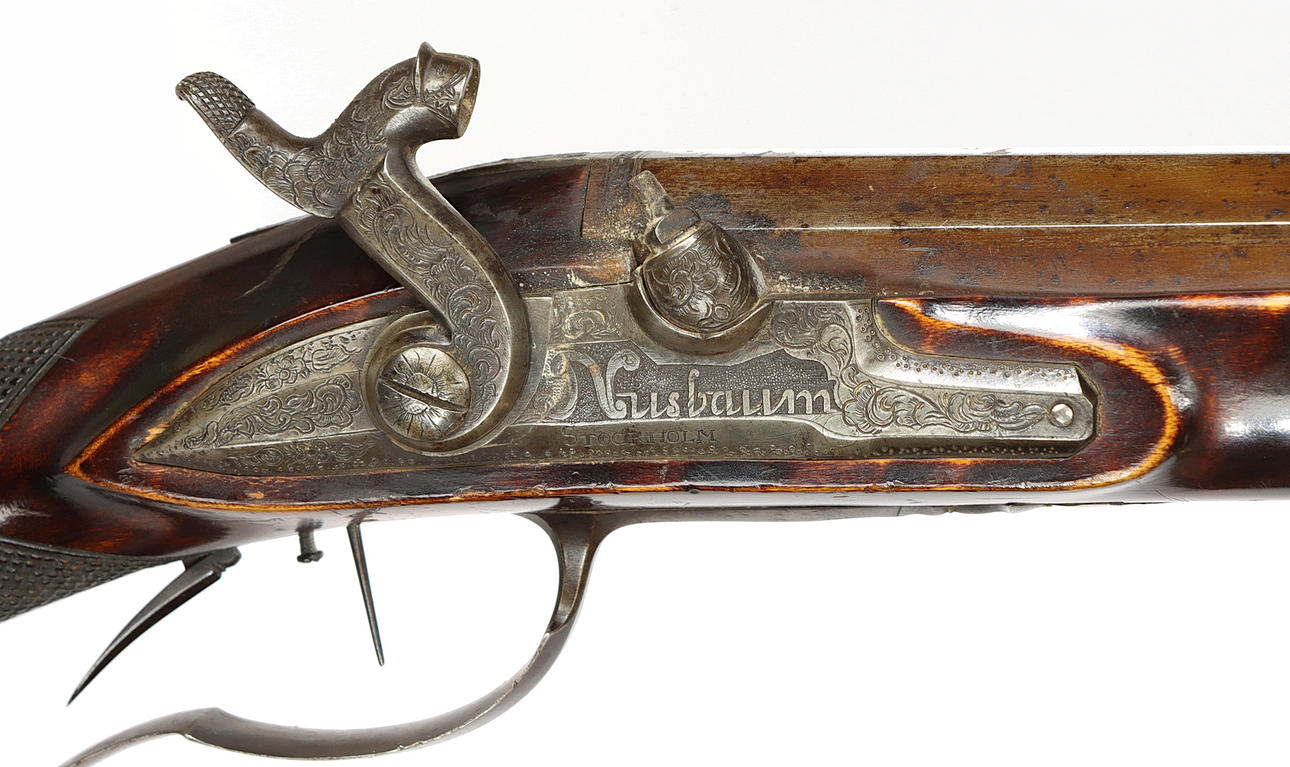 Achteckiger Lauf mit Rille ca. 77,5 cm, Kaliber ca. 19 mm, signiertes Schloss „NUSBAUM STOCKHOLM“, Schwanz und Schloss graviert, verstellbares Visier, freundlicher Druck, von Feuersteinschloss auf Schlagschloss geändert, Holzkolben mit Hornnase und Stahlbeschlägen, Stahlkappe, Holzpfahl.