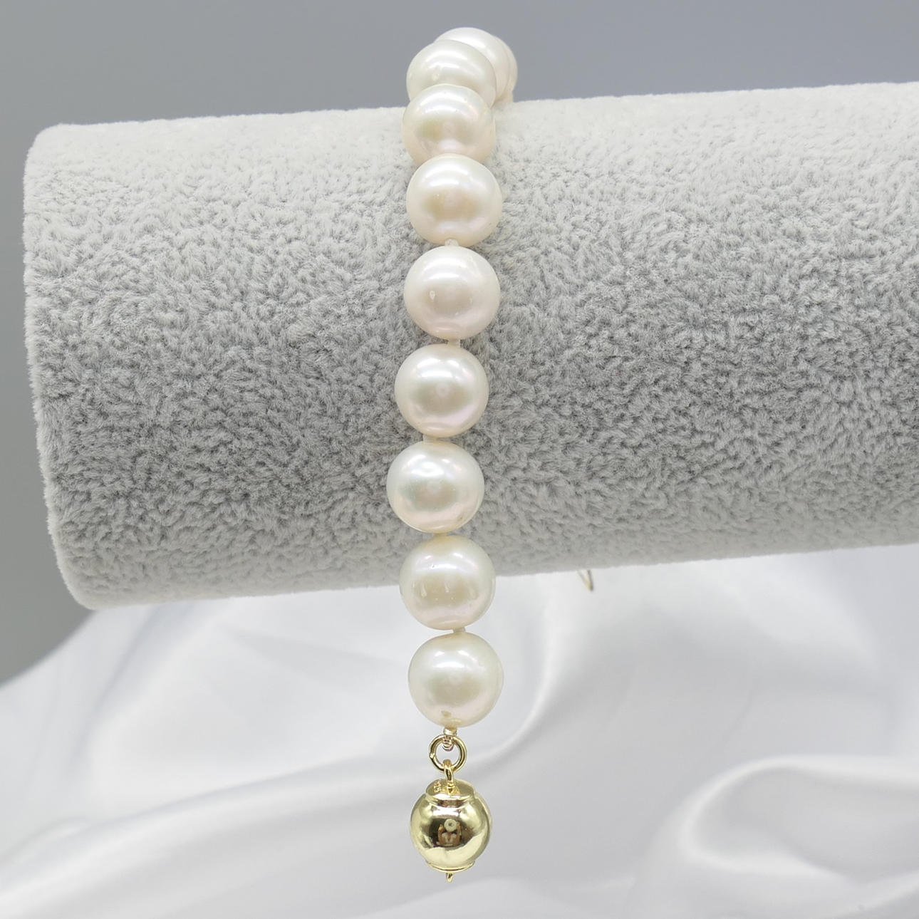 Die Perlen sind fast rund und haben einen Durchmesser von jeweils ca. 8 mm. Das Armband ist 18 cm lang.