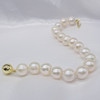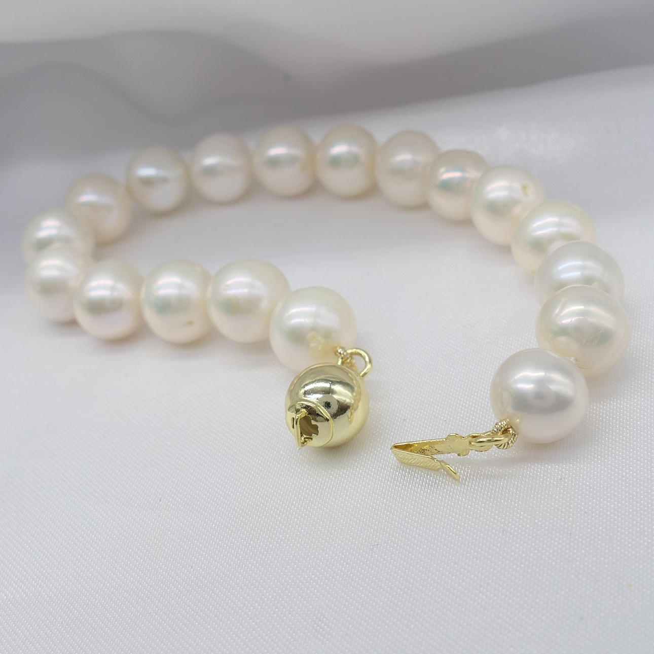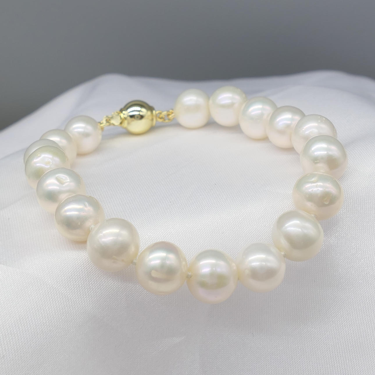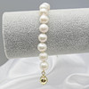 Ein Armband, das mit 18 weißen, organisch geformten Süßwasserzuchtperlen bespannt ist.
